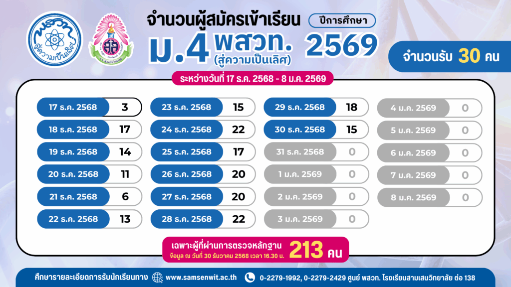 ประกาศโรงเรียนสามเสนวิทยาลัย เรื่อง การรับนักเรียนชั้นมัธยมศึกษาปีที่ 4 (ห้องเรียนพิเศษ) ปีการศึกษา 2569 ห้องเรียน พสวท. (สู่ความเป็นเลิศ) รับสมัครวันที่ 17 ธันวาคม 2568 – 8 มกราคม 2569