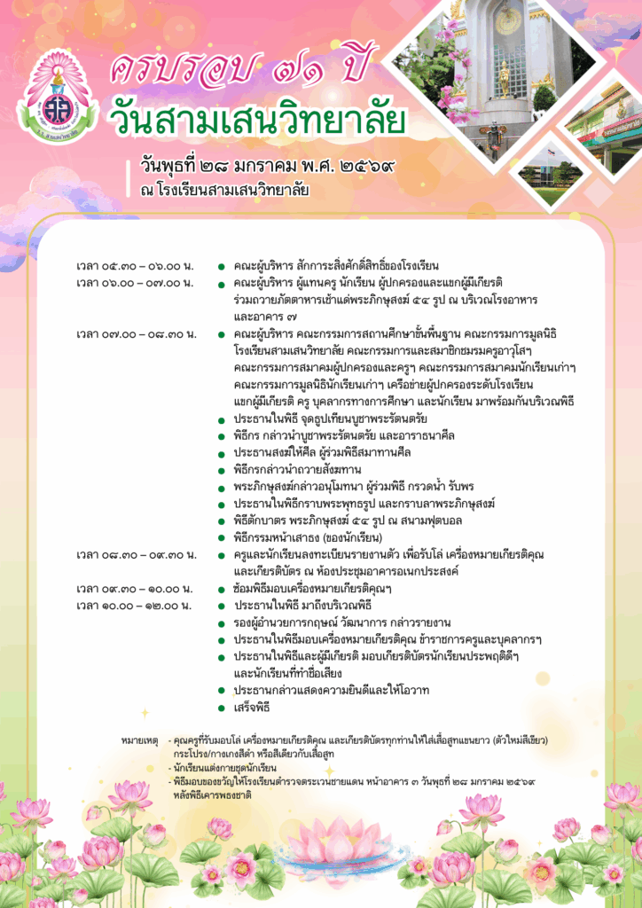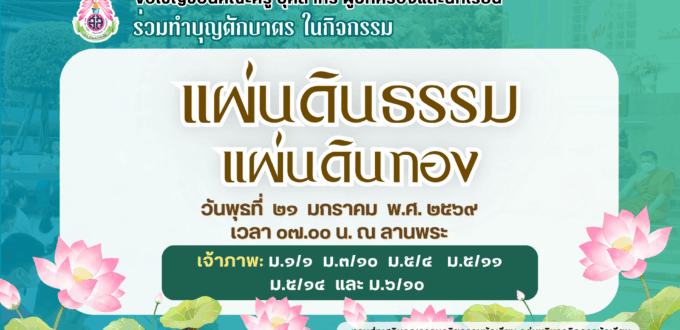 งานส่งเสริมคุณธรรมจริยธรรมนักเรียน กลุ่มบริหารกิจการนักเรียน ขอเชิญชวนคณะครู บุคลากร ผู้ปกครองและนักเรียน ร่วมทำบุญตักบาตรในกิจกรรมแผ่นดินธรรมแผ่นดินทอง ในวันพุธที่ 21 มกราคม 2569 เวลา 07.00 น. ณ ลานพระ
