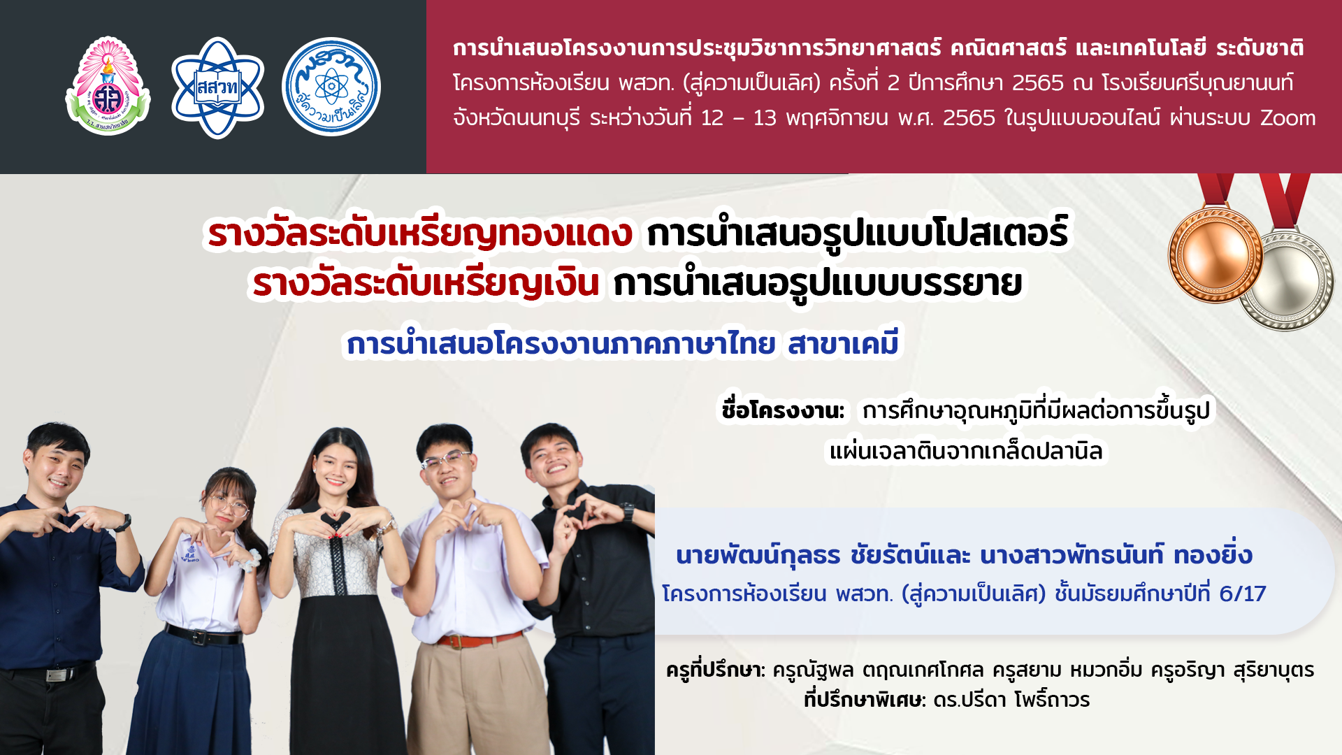 ขอแสดงความยินดีกับนักเรียนห้องเรียน พสวท. (สู่ความเป็นเลิศ) โรงเรียนสามเสนวิทยาลัย ที่ได้รับรางวัลในการนำเสนอโครงงานการประชุมวิชาการวิทยาศาสตร์ คณิตศาสตร์ และเทคโนโลยี ระดับชาติ โครงการห้องเรียน พสวท. (สู่ความเป็นเลิศ) ครั้งที่ 2 ปีการศึกษา 2565
