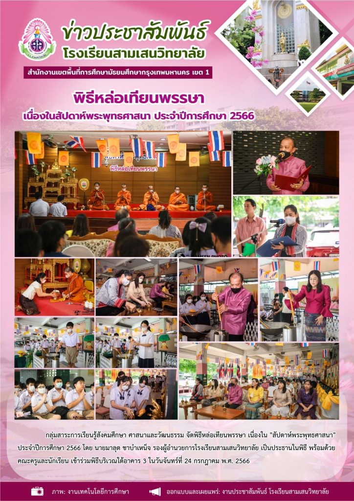 24 กรกฎาคม 2566 พิธีหล่อเทียนพรรษา เนื่องในสัปดาห์พระพุทธศาสนา ประจำปีการศึกษา 256624 กรกฎาคม 2023Written by งานประชาสัมพันธ์