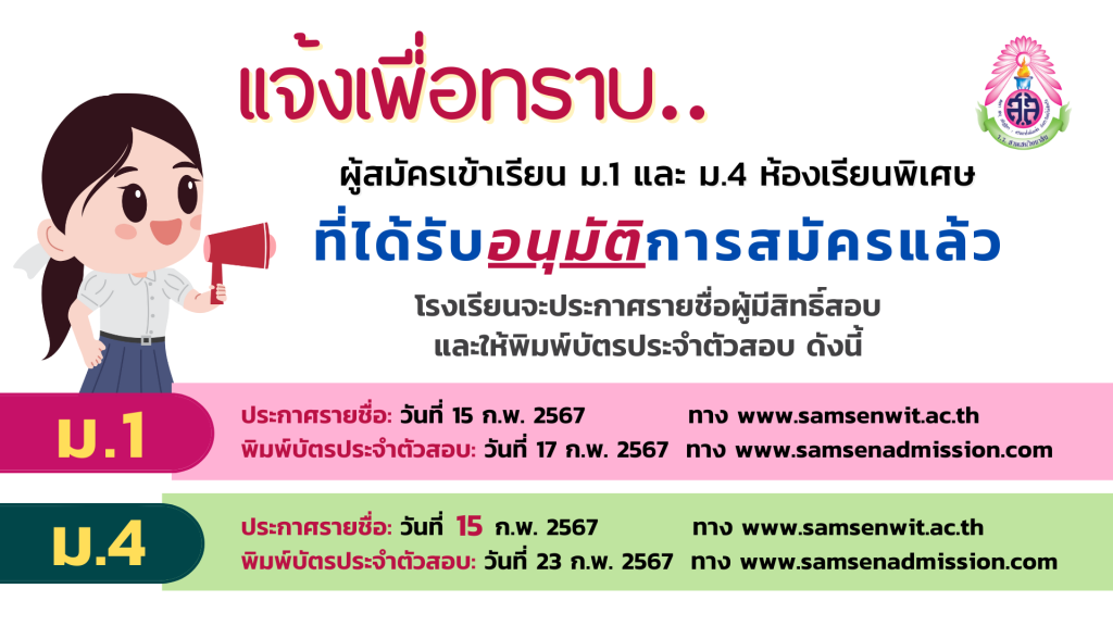 📣ประกาศโรงเรียนสามเสนวิทยาลัย เรื่อง การรับนักเรียนชั้นมัธยมศึกษาปีที่ 4 (ห้องเรียนพิเศษ) ปีการศึกษา 2567