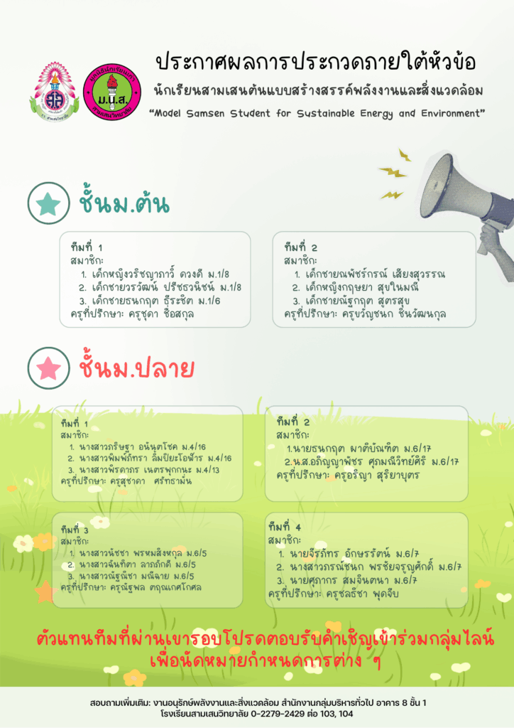 ♻️🌳ประกาศผลการประกวดภายใต้หัวข้อ “นักเรียนสามเสนต้นแบบสร้างสรรค์พลังงานและสิ่งแวดล้อม” Model Samsen Student for Sustainable Energy and Environment” 🌎🔌