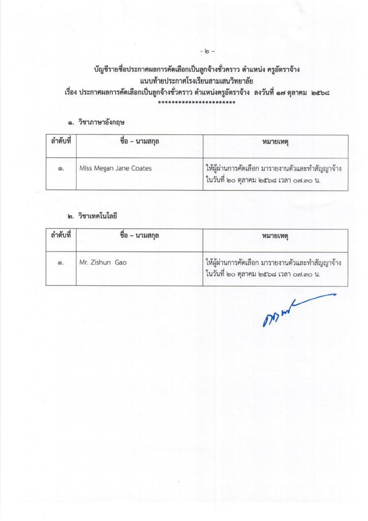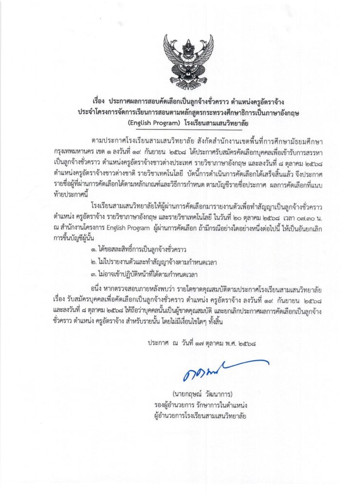 ประกาศผลการสอบคัดเลือกเป็นลูกจ้างชั่วคราว ตำแหน่งครูอัตราจ้าง ประจำโครงการจัดการเรียนการสอนตามหลักสูตรกระทรวงศึกษาธิการเป็นภาษาอังกฤษ (English Program) โรงเรียนสามเสนวิทยาลัย17 ตุลาคม 2025Written by งานประชาสัมพันธ์ ประกาศผลคัดเลือก