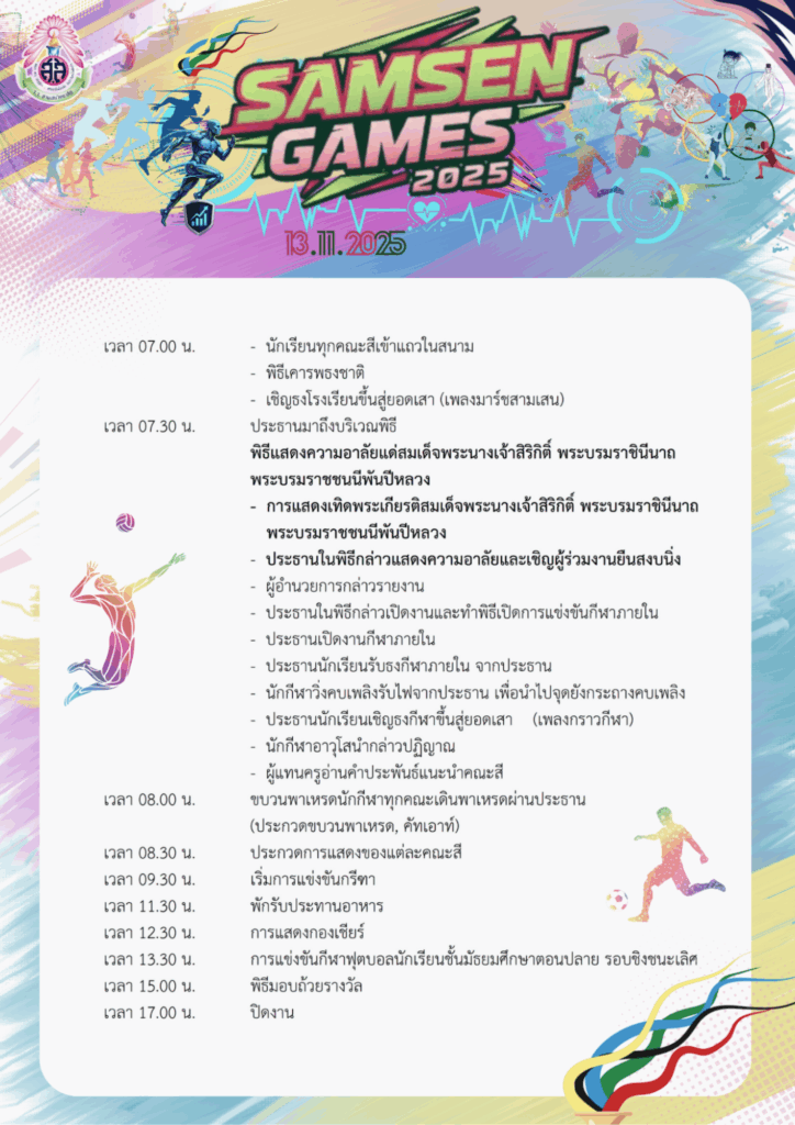 กำหนดการแข่งขันกีฬาภายใน “SAMSEN GAMES 2025” วันที่ 13 พฤศจิกายน 2568 เวลา 07.00 – 17.00 น. ณ โรงเรียนสามเสนวิทยาลัย 💜💛🩵❤️💚5 พฤศจิกายน 2025Written by งานประชาสัมพันธ์ แนวปฏิบัติและมาตรการรักษาความปลอดภัย กิจกรรมการแข่งขันกีฬาภายใน “SAMSEN GAMES 2025”
