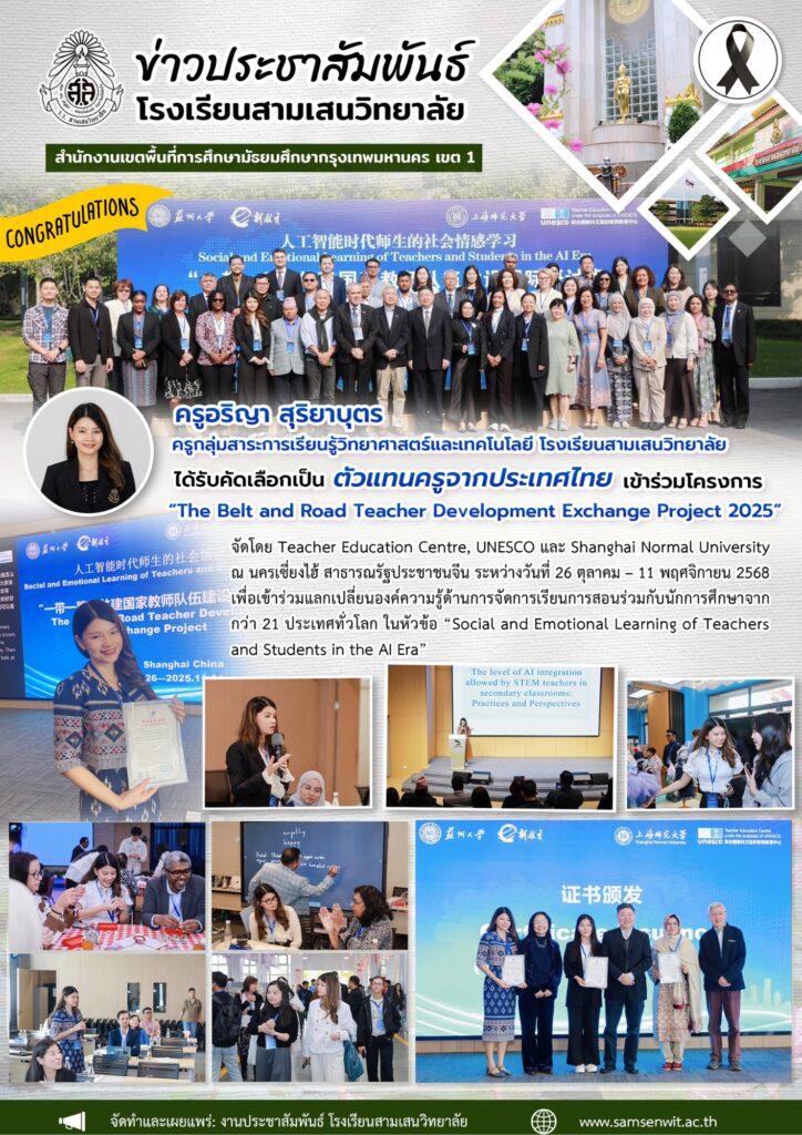 3. ครูอริญา สุริยาบุตร ครูกลุ่มสาระการเรียนรู้วิทยาศาสตร์และเทคโนโลยี โรงเรียนสามเสนวิทยาลัย ได้รับคัดเลือกเป็นตัวแทนครูจากประเทศไทย เข้าร่วมโครงการ “The Belt and Road Teacher Development Exchange Project 2025” จัดโดย Teacher Education Centre, UNESCO และ Shanghai Normal University ณ นครเซี่ยงไฮ้ สาธารณรัฐประชาชนจีน