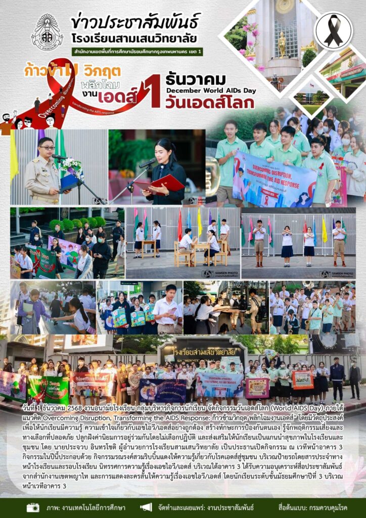 3. 1 ธันวาคม 2568 งานอนามัยโรงเรียน โรงเรียนสามเสนวิทยาลัย จัดกิจกรรม 1 ธันวาคม วันเอดส์โลก (World AIDS Day) ภายใต้แนวคิด Overcoming Disruption, Transforming the AIDS Response: ก้าวข้ามวิกฤต พลิกโฉมงานเอดส์”