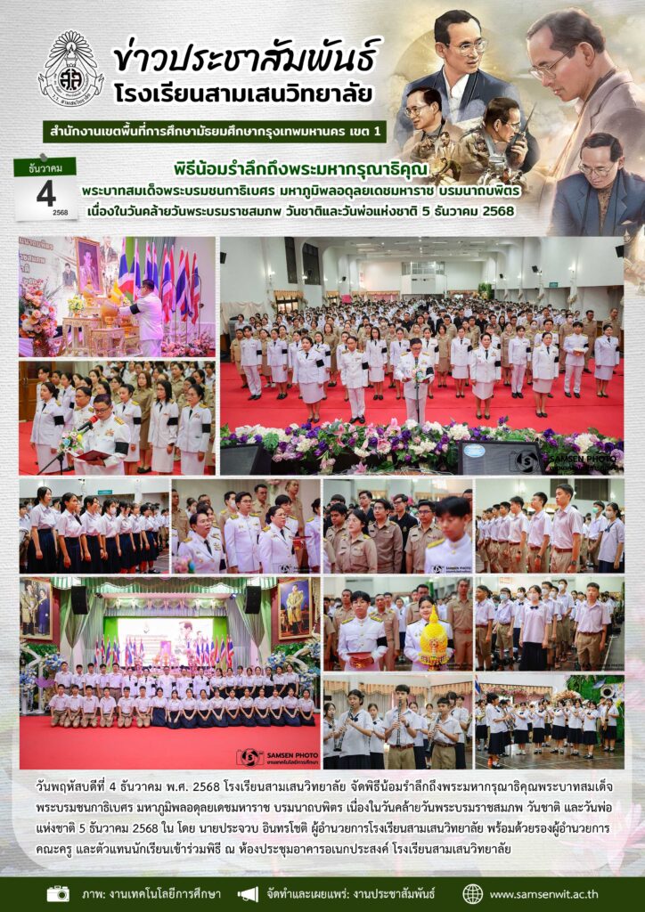 4 ธันวาคม 2568 โรงเรียนสามเสนวิทยาลัย จัดพิธีน้อมรำลึกถึงพระมหากรุณาธิคุณ พระบาทสมเด็จพระบรมชนกาธิเบศร มหาภูมิพลอดุลยเดชมหาราช บรมนาถบพิตร เนื่องในวันคล้ายวันพระบรมราชสมภพ วันชาติและวันพ่อแห่งชาติ 5 ธันวาคม 25684 ธันวาคม 2025Written by งานประชาสัมพันธ์