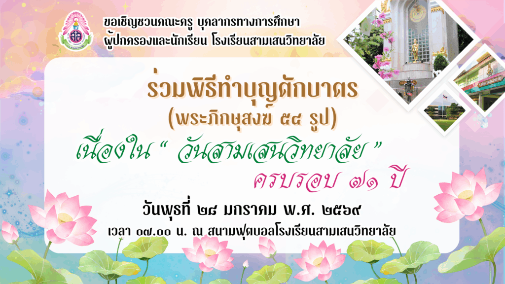 ขอเชิญชวนคณะครู บุคลากรทางการศึกษาและนักเรียน โรงเรียนสามเสนวิทยาลัย 🙏 ร่วมพิธีทำบุญตักบาตร (พระภิกษุสงฆ์ ๕๔ รูป) เนื่องใน “วันสามเสนวิทยาลัย” ครบรอบ ๗๑ ปี ในวันพุธที่ ๒๘ มกราคม พ.ศ. ๒๕๖๙ เวลา ๐๗.๐๐ น. ณ สนามฟุตบอลโรงเรียนสามเสนวิทยาลัย