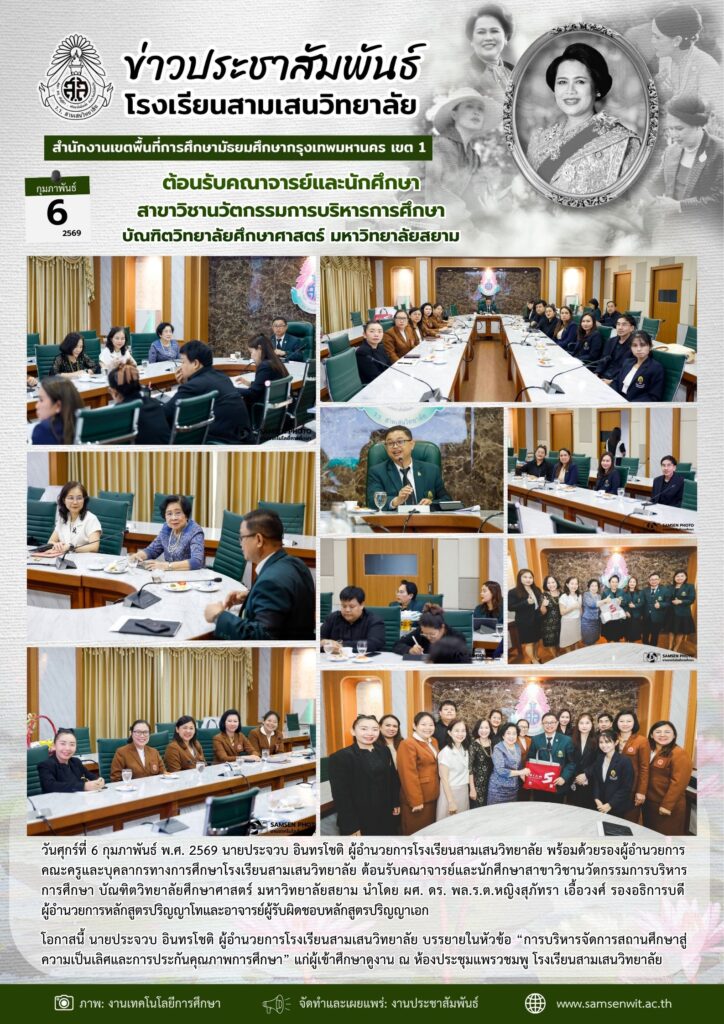คณาจารย์และนักศึกษา สาขาวิชานวัตกรรมการบริหารการศึกษา บัณฑิตวิทยาลัยศึกษาศาสตร์ มหาวิทยาลัยสยาม ศึกษาดูงาน “การบริหารจัดการสถานศึกษาและการประกันคุณภาพการศึกษาของโรงเรียนสามเสนวิทยาลัย6 กุมภาพันธ์ 2026Written by งานประชาสัมพันธ์