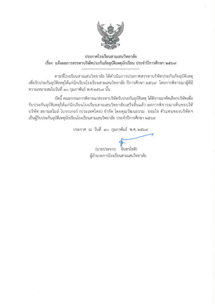 ประกาศโรงเรียนสามเสนวิทยาลัย เรื่อง แจ้งผลการสรรหาบริษัทประกันอุบัติเหตุนักเรียน ประจำปีการศึกษา 2569