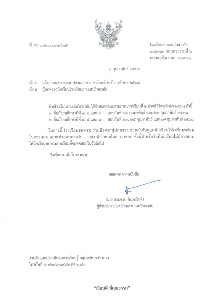 📝 หนังสือแจ้งผู้ปกครอง เรื่องกำหนดการสอบปลายภาค ภาคเรียนที่ 2 ปีการศึกษา 2568