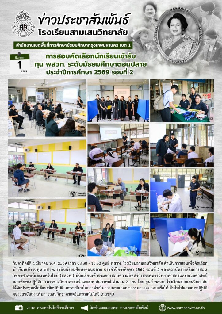 1 มีนาคม 2569 การสอบคัดเลือกนักเรียนเข้ารับ ทุน พสวท. ระดับมัธยมศึกษาตอนปลาย ประจำปีการศึกษา 2569 รอบที่ 21 มีนาคม 2026Written by งานประชาสัมพันธ์