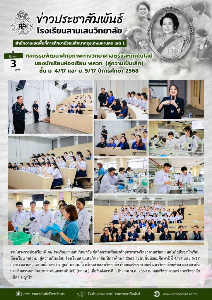 3 มีนาคม 2569 กิจกรรมพัฒนาศักยภาพทางวิทยาศาสตร์และเทคโนโลยี ของนักเรียนห้องเรียน พสวท. (สู่ความเป็นเลิศ) ชั้น ม. 4/17 และ ม. 5/17 ปีการศึกษา 25683 มีนาคม 2026Written by งานประชาสัมพันธ์