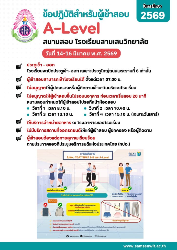 ข้อปฏิบัติสำหรับผู้เข้าสอบ A-Level ปีการศึกษา 2569 สนามสอบ โรงเรียนสามเสนวิทยาลัย วันที่ 14 – 16 มีนาคม พ.ศ. 256910 มีนาคม 2026Written by งานประชาสัมพันธ์