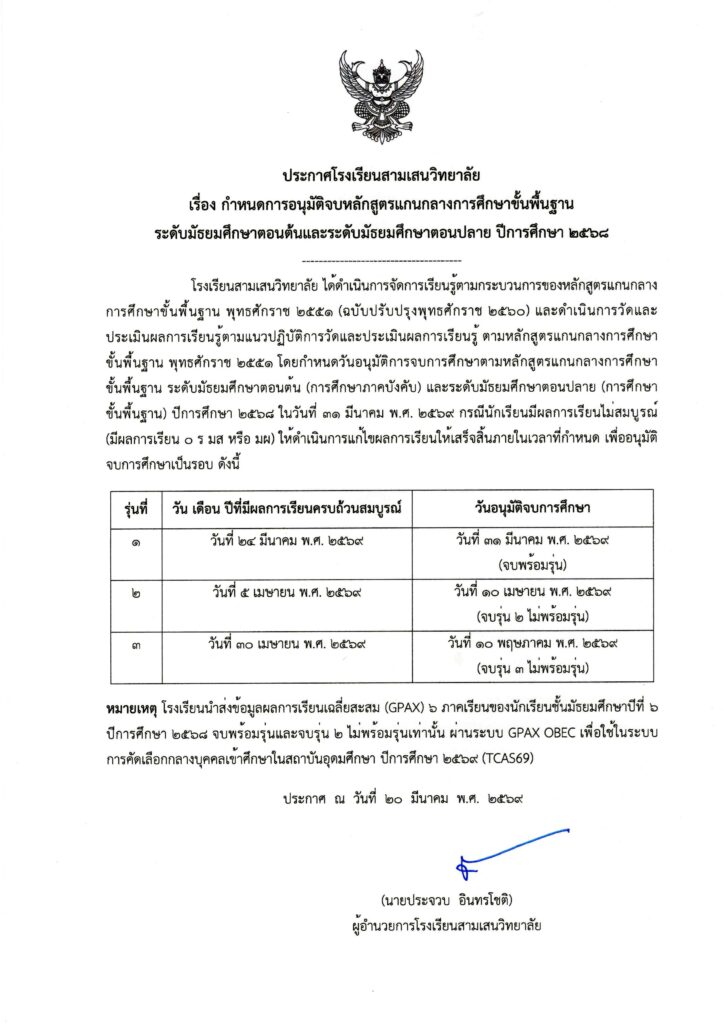ประกาศโรงเรียนสามเสนวิทยาลัย เรื่อง กำหนดการอนุมัติจบหลักสูตรแกนกลางการศึกษาขั้นพื้นฐาน ระดับมัธยมศึกษาตอนต้นและระดับมัธยมศึกษาตอนปลาย ปีการศึกษา 2568