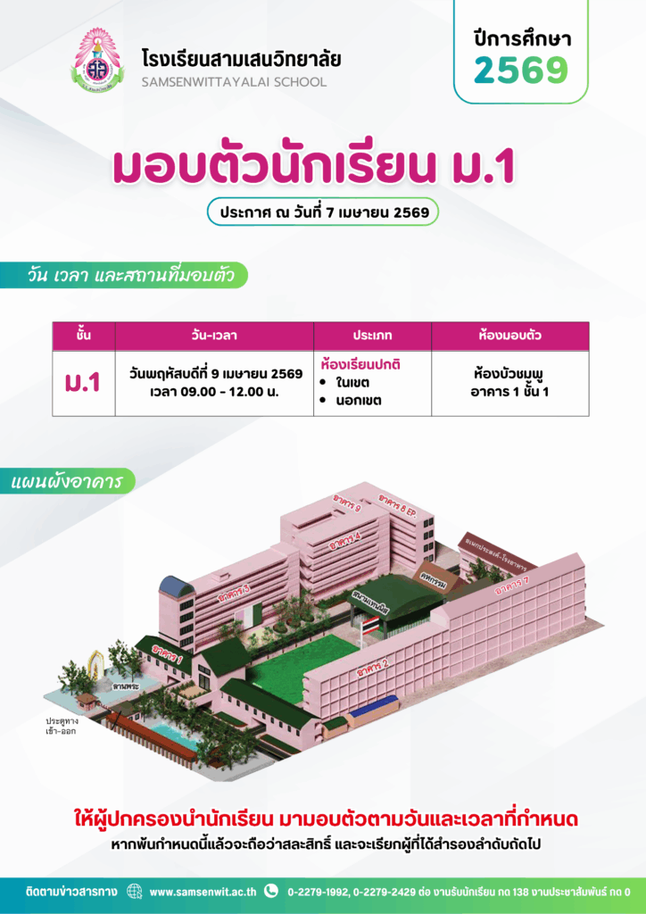 🟦 นักเรียนที่ไม่ประสงค์เข้าศึกษาต่อระดับชั้น ม.1 และ ม.4 โรงเรียนสามเสนวิทยาลัย ปีการศึกษา 2569 สามารถยื่นคำร้องขอสละสิทธิ์ทางอีเมล education@samsenwit.ac.th