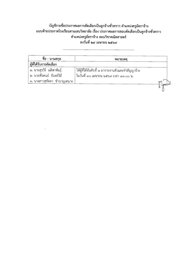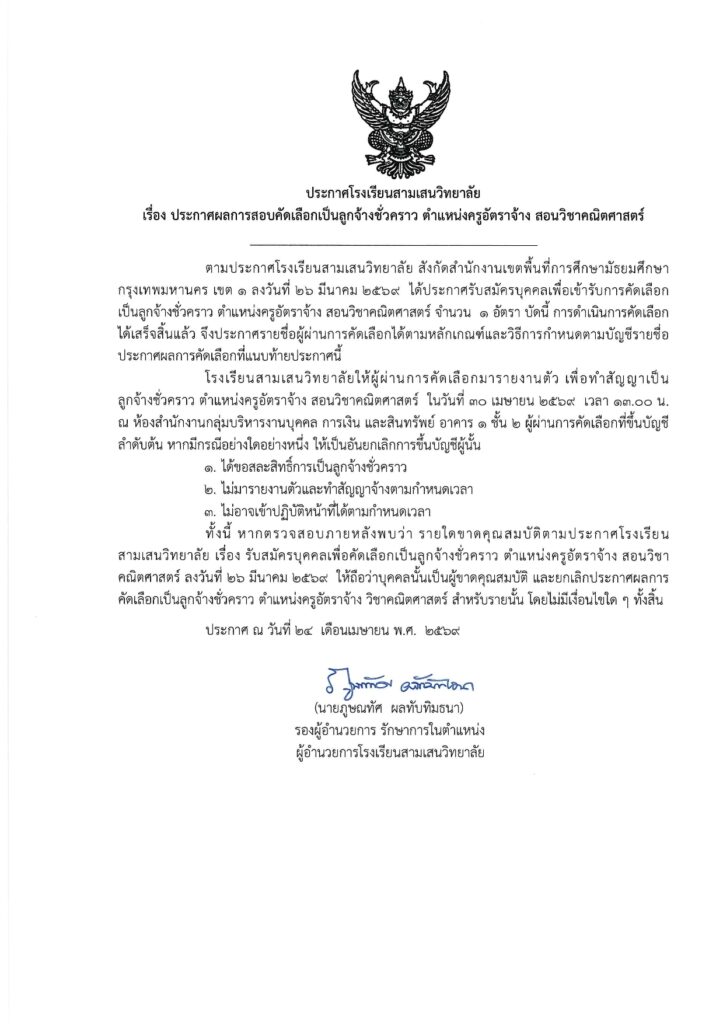 ประกาศโรงเรียนสามเสนวิทยาลัย เรื่อง ประกาศผลการสอบคัดเลือกเป็นลูกจ้างชั่วคราว ตำแหน่งครูอัตราจ้าง สอนวิชาคณิตศาสตร์27 เมษายน 2026Written by งานประชาสัมพันธ์
