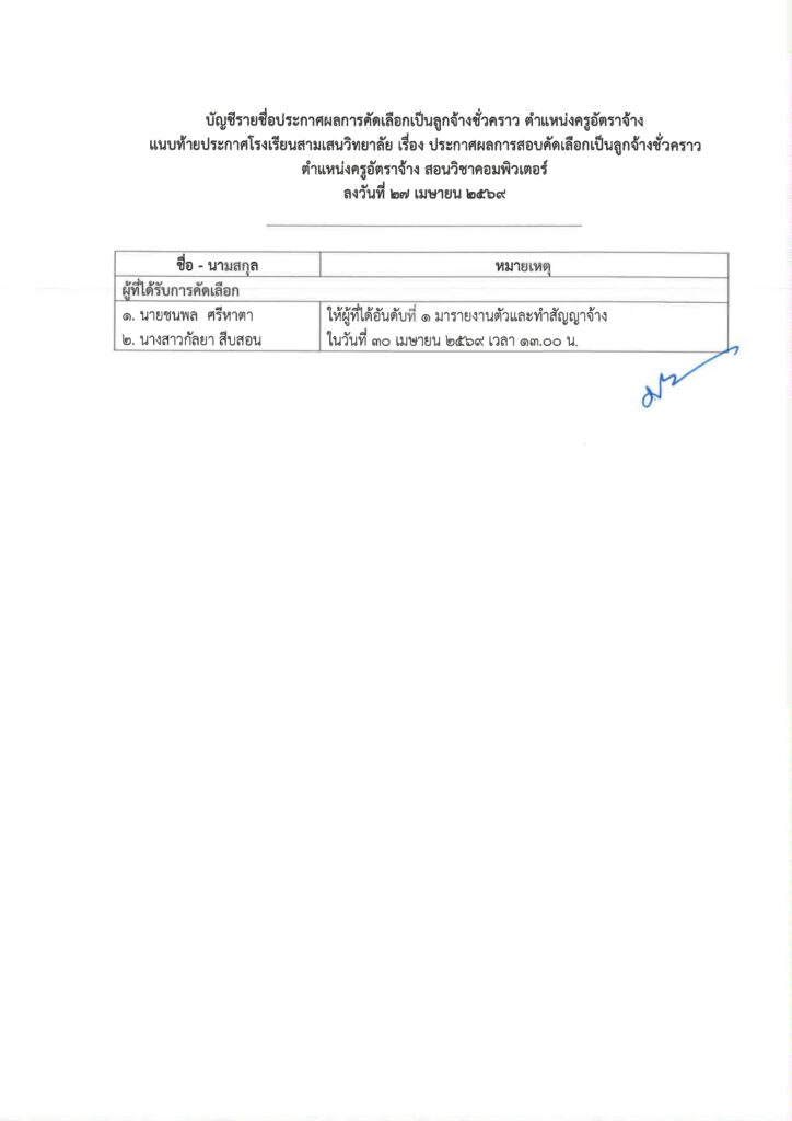 3. ประกาศโรงเรียนสามเสนวิทยาลัย เรื่อง ประกาศผลการสอบคัดเลือกเป็นลูกจ้างชั่วคราว ตำแหน่งครูอัตราจ้าง สอนวิชาคอมพิวเตอร์