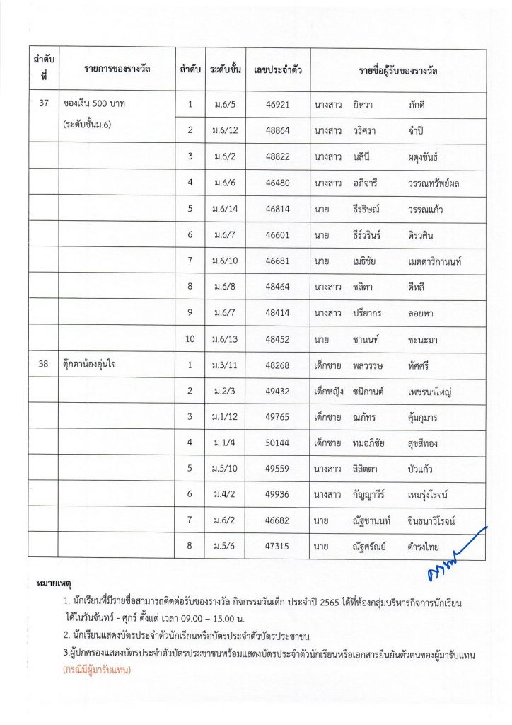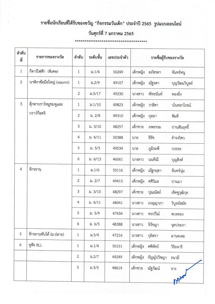 ประกาศรายชื่อนักเรียนที่ได้รับของขวัญ “กิจกรรมวันเด็ก” ประจำปี 2565 รูปแบบออนไลน์ วันศุกร์ที่ 7 มกราคม 256511 มกราคม 2022Written by งานประชาสัมพันธ์ รายชื่อนักเรียนที่ได้รับของขวัญ “กิจกรรมวันเด็ก” ประจำปี 2565ดาวน์โหลด