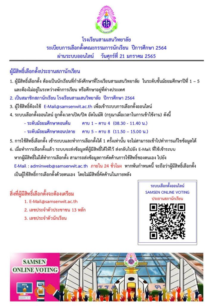 ให้นักเรียนศึกษาระเบียบการเลือกตั้งคณะกรรมการนักเรียน ปีการศึกษา 2564 และเข้าระบบเลือกตั้งตามเวลาที่กำหนด ผ่าน link