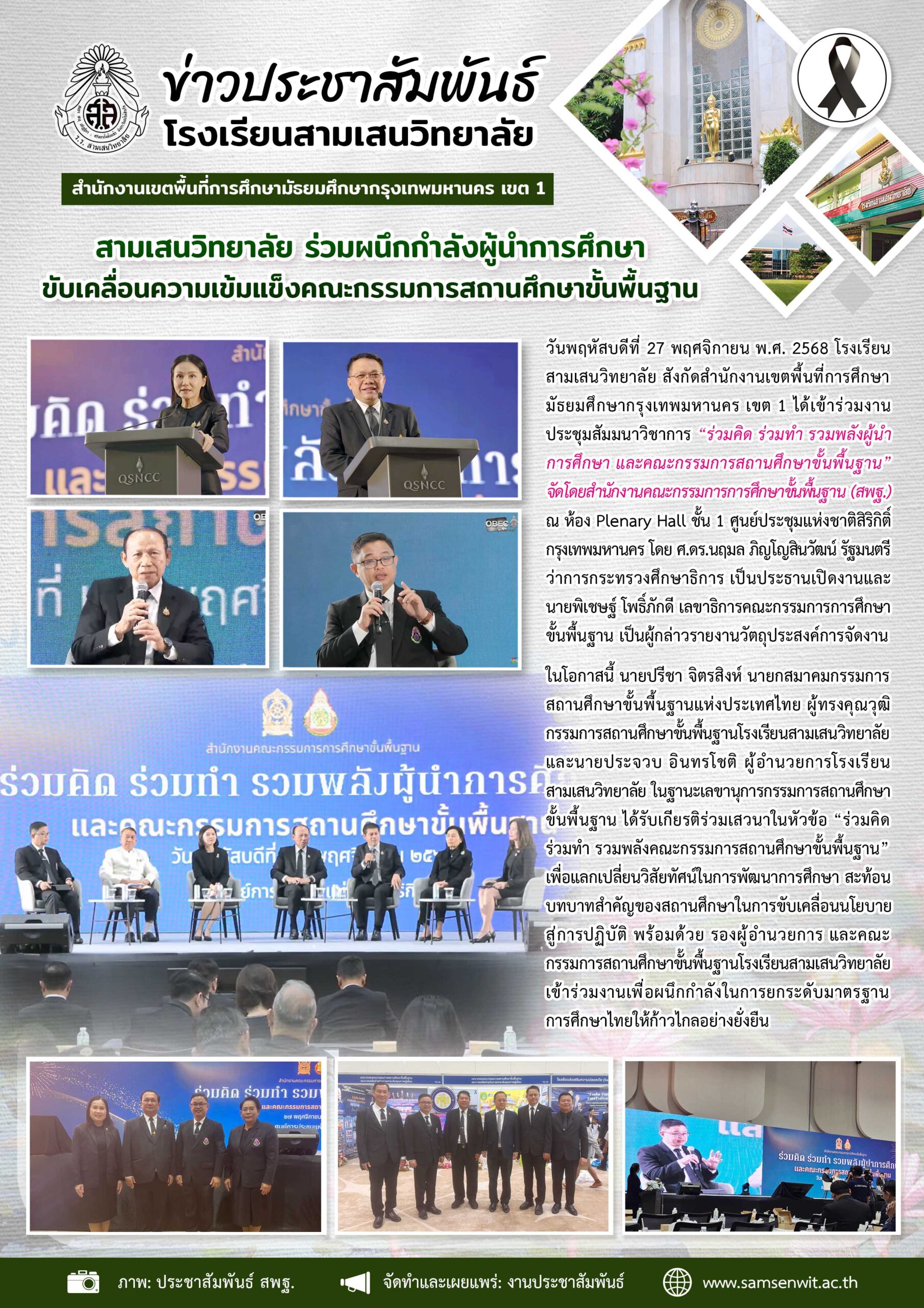 27 พฤศจิกายน 2568 “สามเสนวิทยาลัย ร่วมผนึกกำลังผู้นำการศึกษา ขับเคลื่อนความเข้มแข็งคณะกรรมการสถานศึกษาขั้นพื้นฐาน” ในงานประชุมสัมมนาวิชาการ “ร่วมคิด ร่วมทำ รวมพลังผู้นำการศึกษา และคณะกรรมการสถานศึกษาขั้นพื้นฐาน” จัดโดย สำนักงานคณะกรรมการการศึกษาขั้นพื้นฐาน (สพฐ.) ณ ห้อง Plenary Hall ชั้น 1 ศูนย์ประชุมแห่งชาติสิริกิติ์ กรุงเทพมหานคร