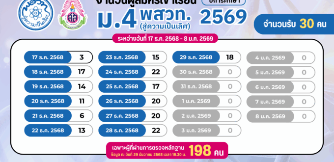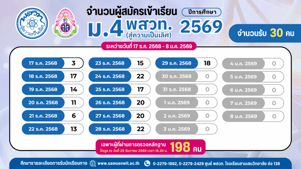 จำนวนผู้สมัครเข้าเรียน ระดับชั้น ม.4 ห้องเรียน พสวท. (สู่ความเป็นเลิศ) ปีการศึกษา 2569 ระหว่างวันที่ 17 ธ.ค. 2568 – 8 ม.ค. 2569 (เฉพาะผู้ที่ผ่านการตรวจหลักฐาน) ประกาศโรงเรียนสามเสนวิทยาลัย เรื่อง การรับนักเรียนชั้นมัธยมศึกษาปีที่ 4 (ห้องเรียนพิเศษ) ปีการศึกษา 2569 ห้องเรียน พสวท. (สู่ความเป็นเลิศ) รับสมัครวันที่ 17 ธันวาคม 2568 – 8 มกราคม 2569