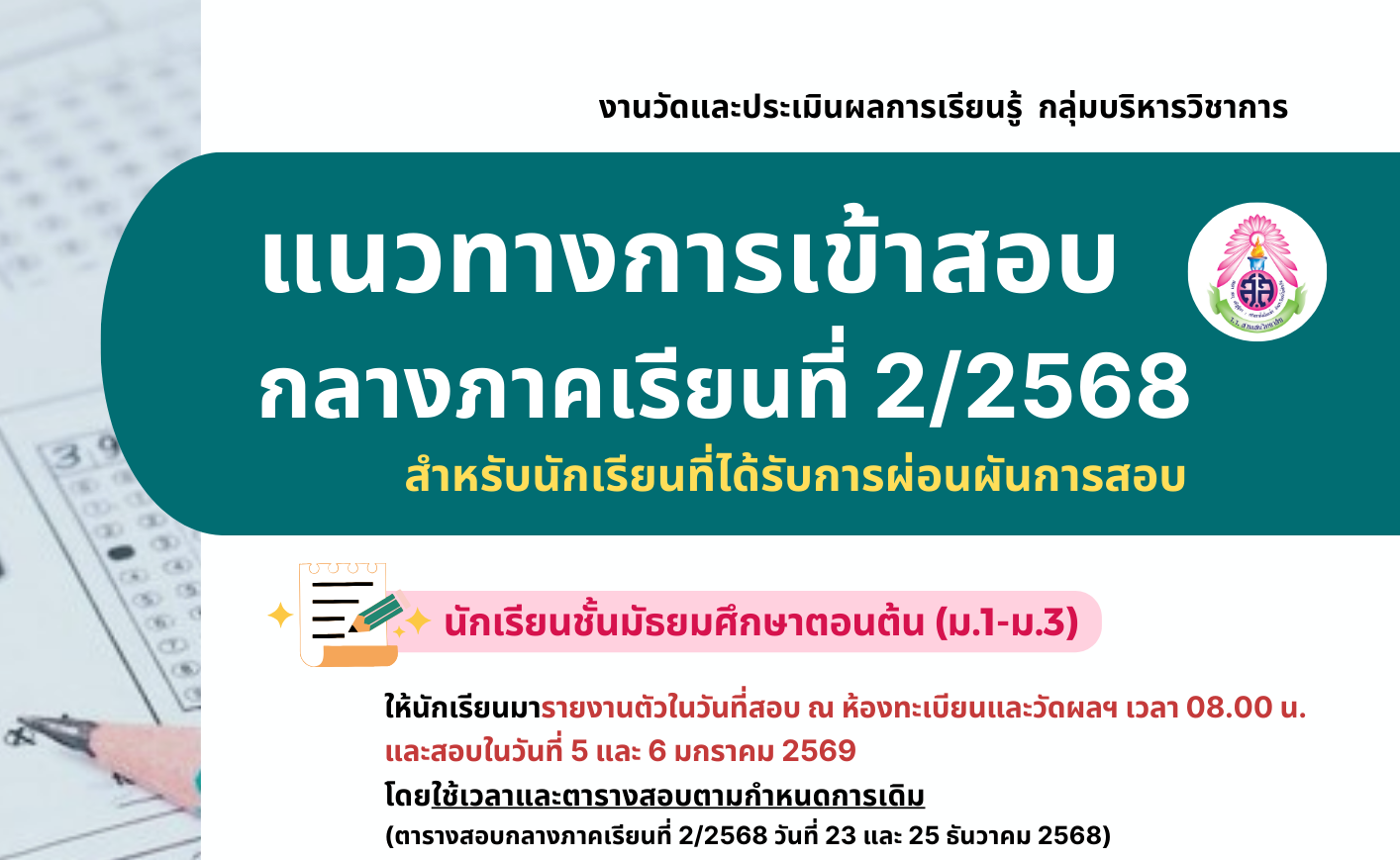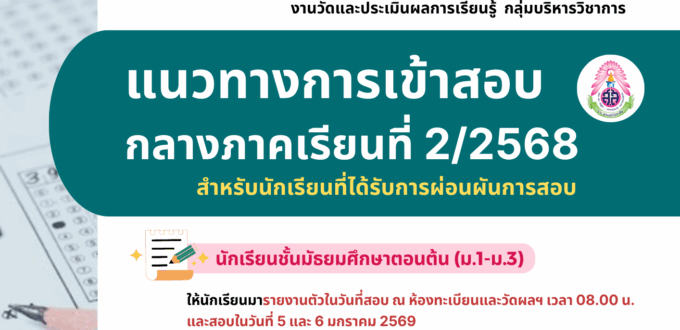 แนวทางการเข้าสอบกลางภาคเรียนที่ 2 ปีการศึกษา 2568 สำหรับนักเรียนที่ได้รับการผ่อนผันการสอบ โดย งานวัดและประเมินผลการเรียนรู้ กลุ่มบริหารวิชาการ