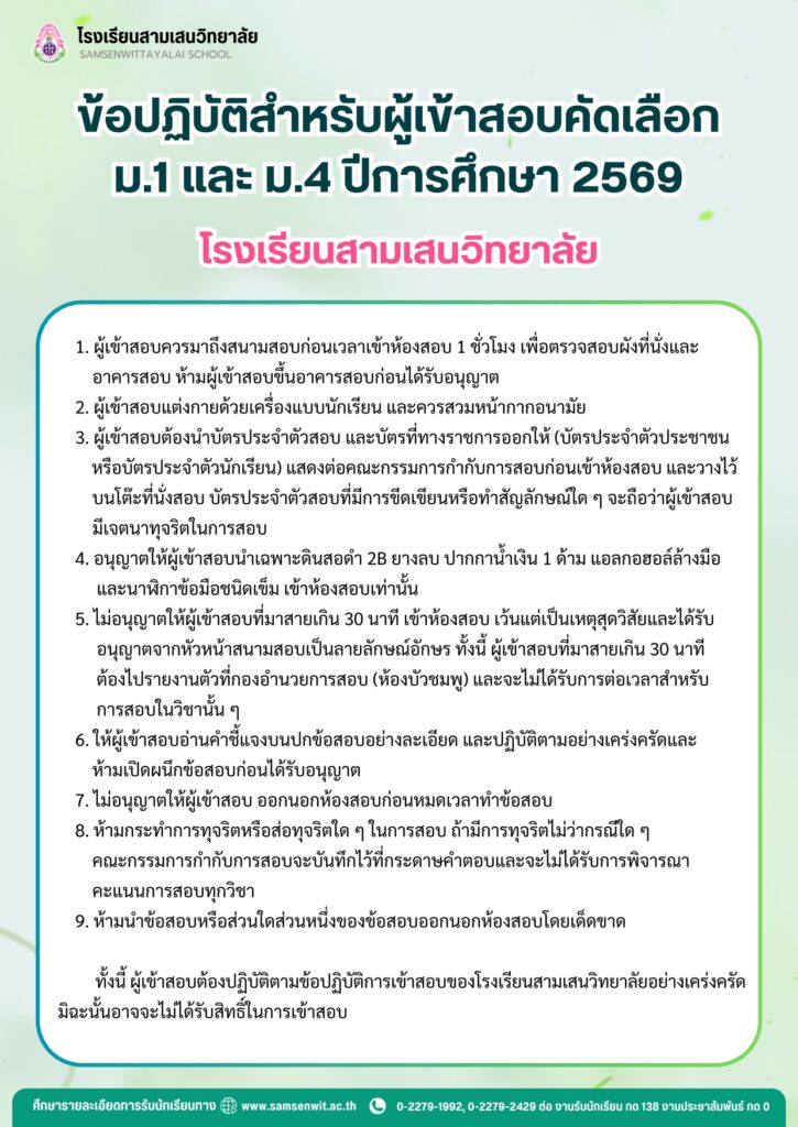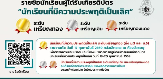 รายงานตัว: วันพรุ่งนี้ (17 กุมภาพันธ์ 2569) หลังเลิกแถว ณ ห้องบัวชมพู เพื่อตรวจความเรียบร้อย และชี้แจงแนวทางการปฎิบัติในการมอบเกียรติบัตรนักเรียนที่มีความประพฤติเป็นเลิศ วันที่ 19-20 กุมภาพันธ์ 2569
