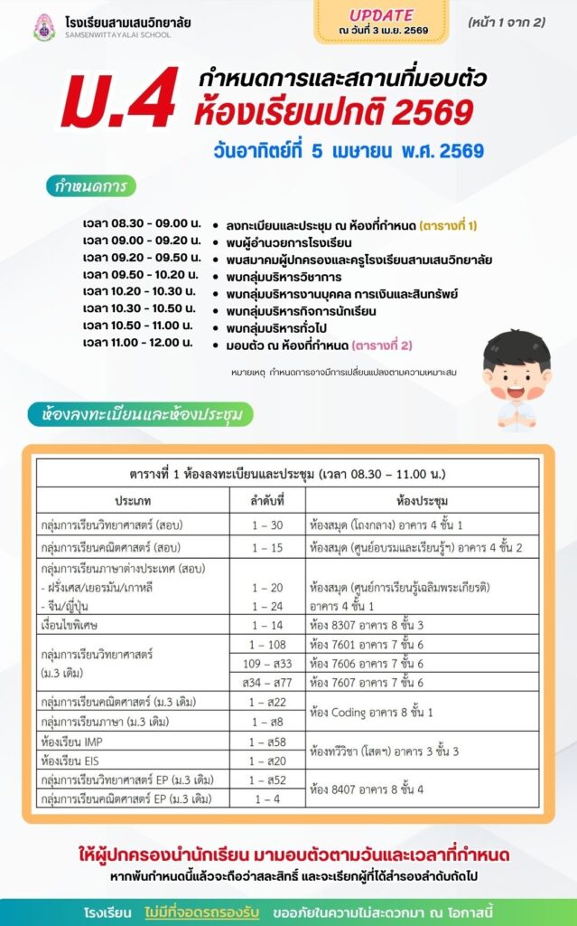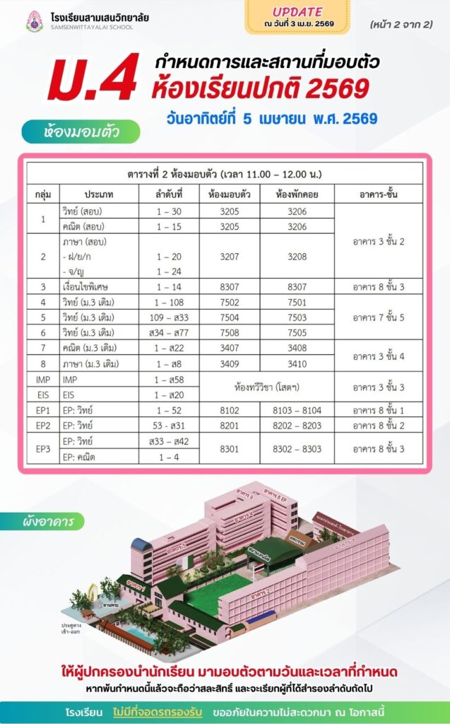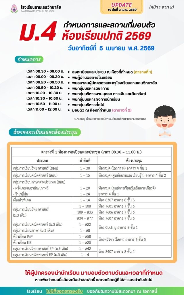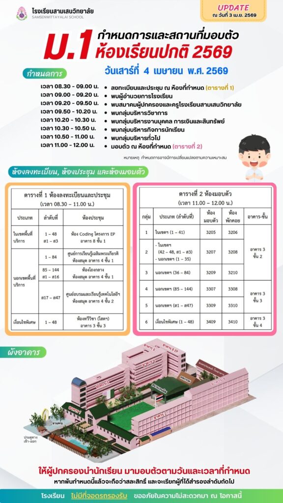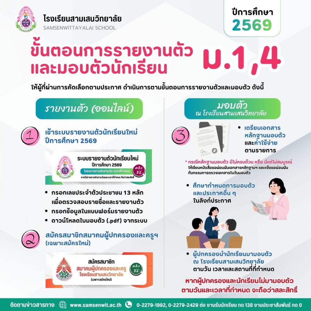 มามอบตัวในวันที่ 5 เมษายน 2569 เวลา 09.00 – 12.00 ณ โรงเรียนสามเสนวิทยาลัย