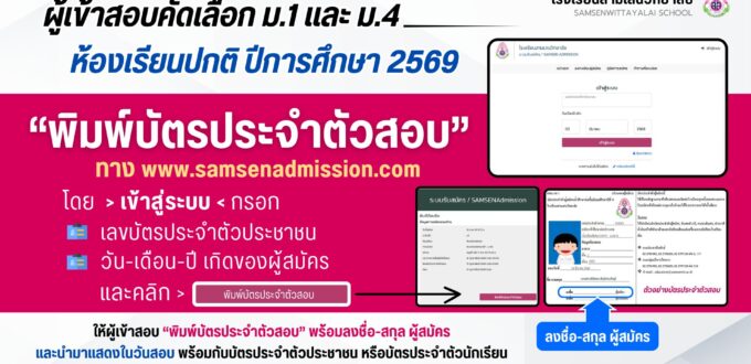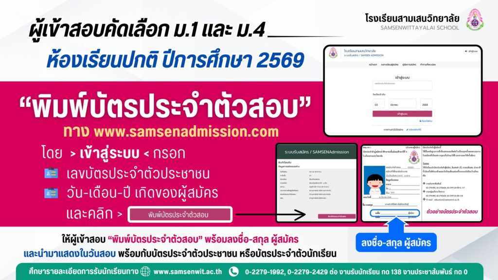 📝 ให้ผู้สมัครที่มีรายชื่อตามประกาศรายชื่อนักเรียนที่มีสิทธิ์สอบคัดเลือกฯ พิมพ์บัตรประจำตัวสอบ ทาง www.samsenadmission.com