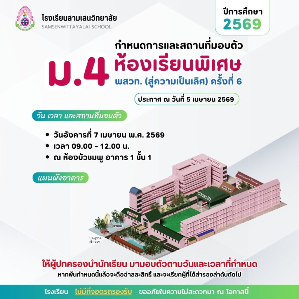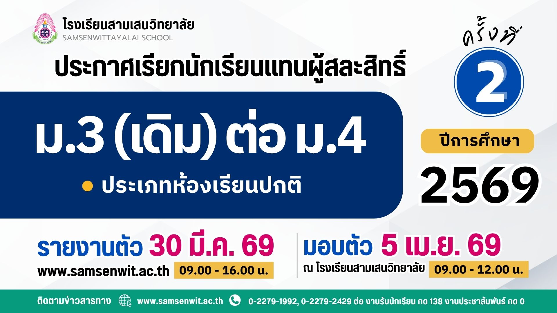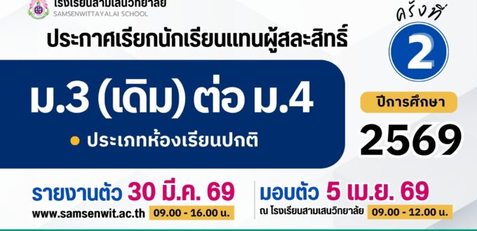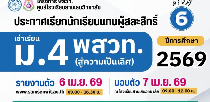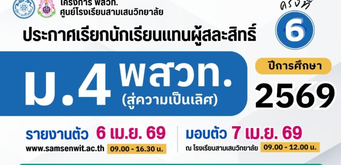 🟦 นักเรียนที่ไม่ประสงค์เข้าศึกษาต่อระดับชั้น ม.1 และ ม.4 โรงเรียนสามเสนวิทยาลัย ปีการศึกษา 2569 สามารถยื่นคำร้องขอสละสิทธิ์ทางอีเมล education@samsenwit.ac.th