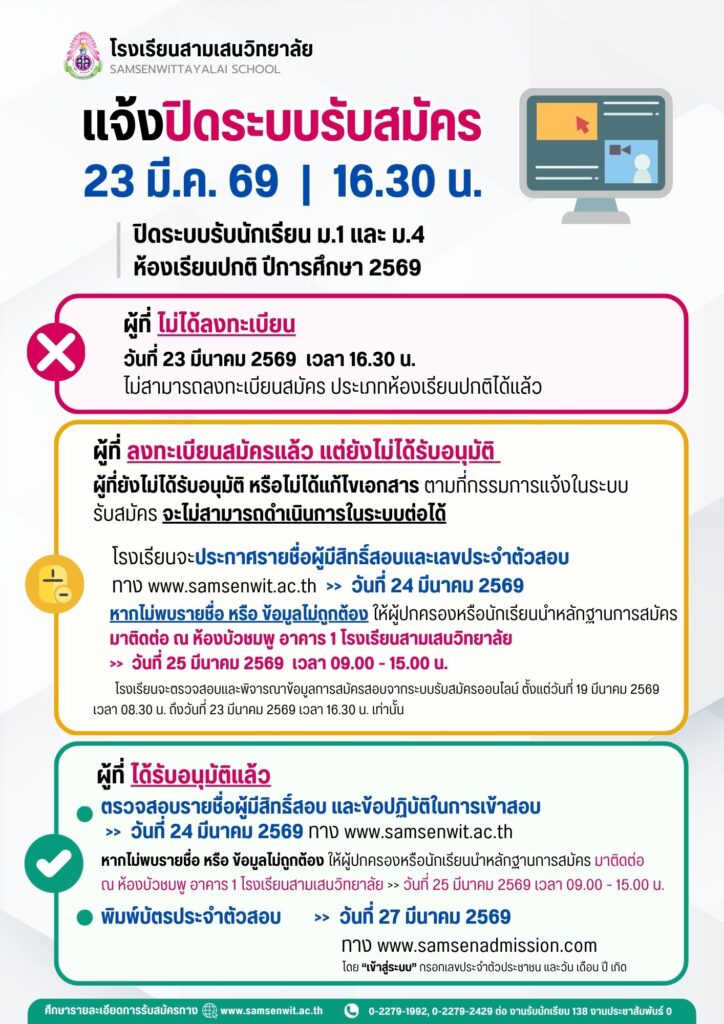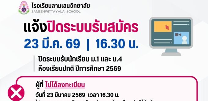 แจ้งการปิดระบบรับสมัครนักเรียน ม.1 และ ม.4 ห้องเรียนปกติ ปีการศึกษา 2569 วันจันทร์ที่ 23 มีนาคม 2569 ❌ ปิดระบบเวลา 16.30 น. ❌