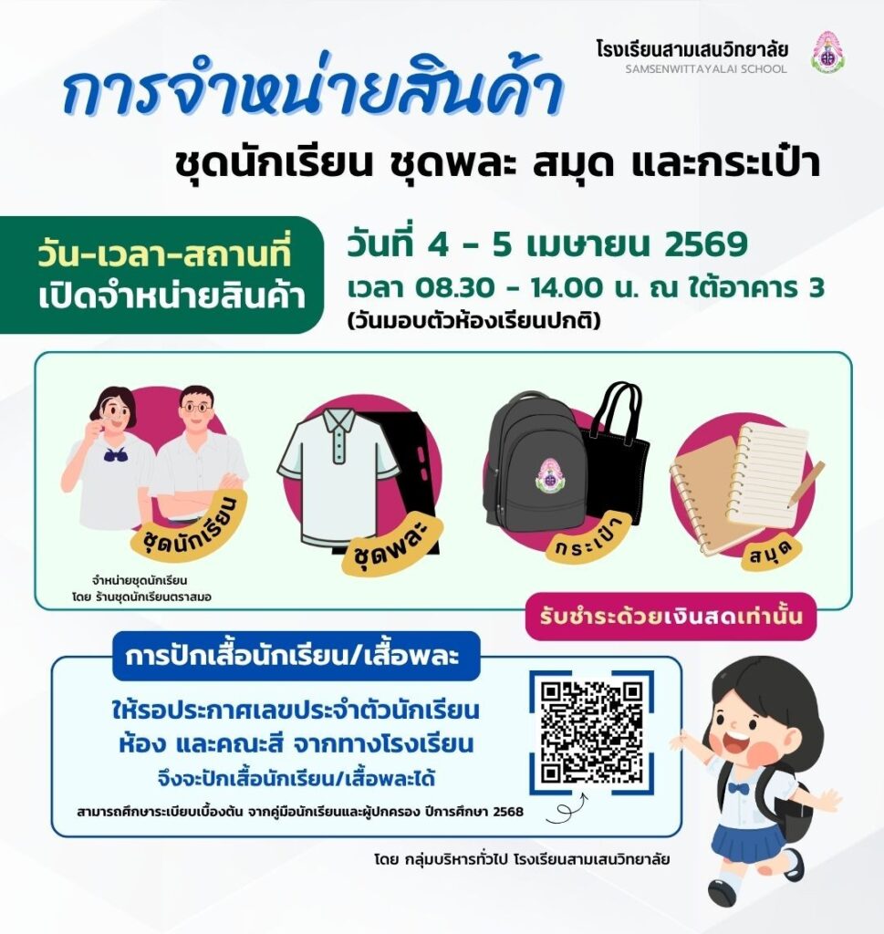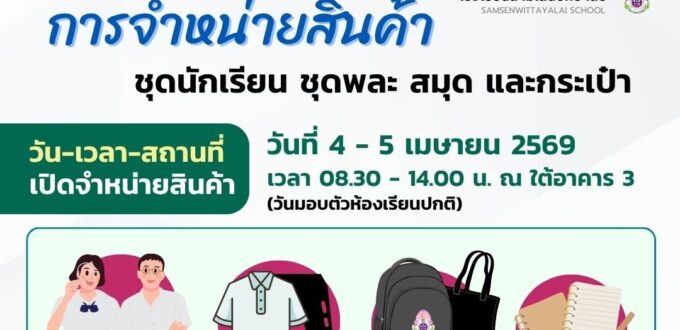 โรงเรียนสามเสนวิทยาลัย เปิดจำหน่ายสินค้า ชุดนักเรียน ชุดพละ สมุด และกระเป๋า ในวันที่ 4 – 5 เมษายน 2569 (วันมอบตัวห้องเรียนปกติ) เวลา 08.30 – 14.00 น. ณ ใต้อาคาร 3