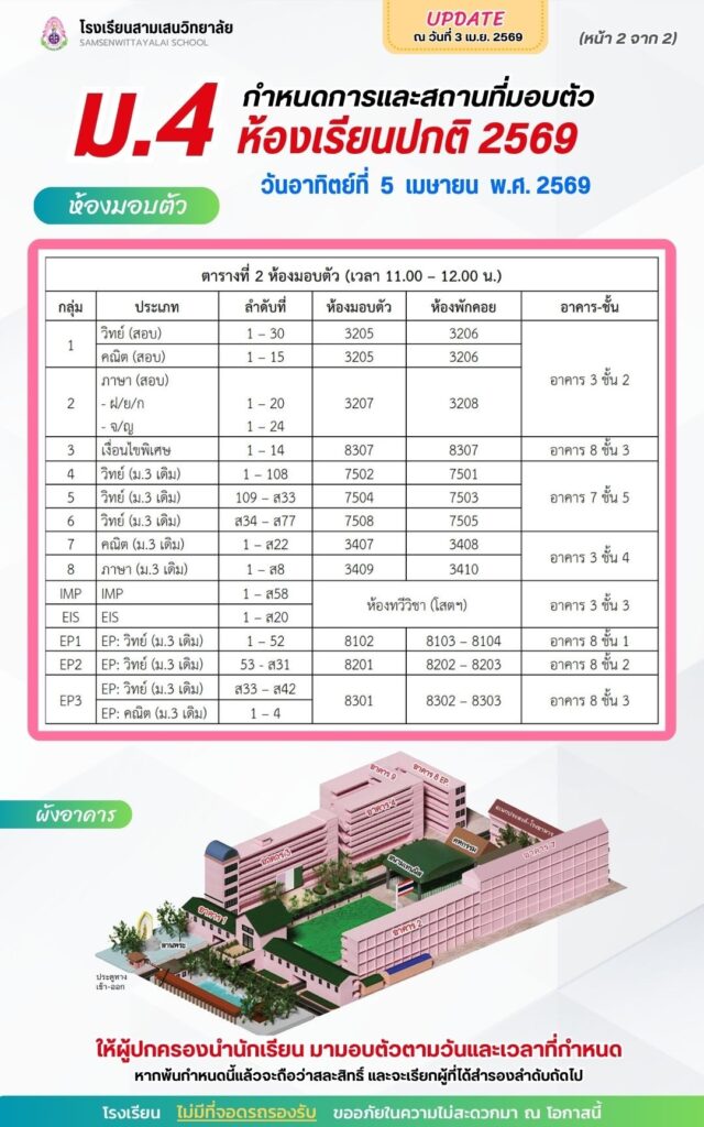 ประกาศโรงเรียนสามเสนวิทยาลัย เรื่อง เรียกนักเรียนแทนผู้สละสิทธิ์เข้าศึกษาต่อระดับชั้นมัธยมศึกษาปีที่ 4 ปีการศึกษา 2569 ห้องเรียนพิเศษภายใน IMP และ EIS ครั้งที่ 4 (ประกาศ ณ วันที่ 3 เมษายน 2569)