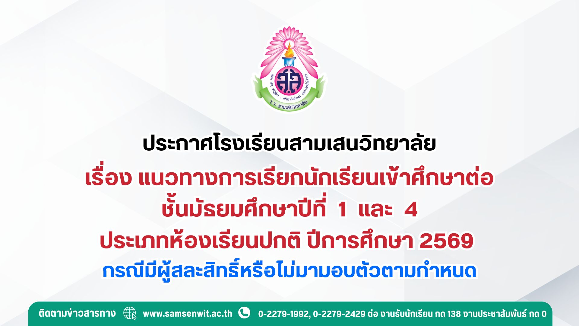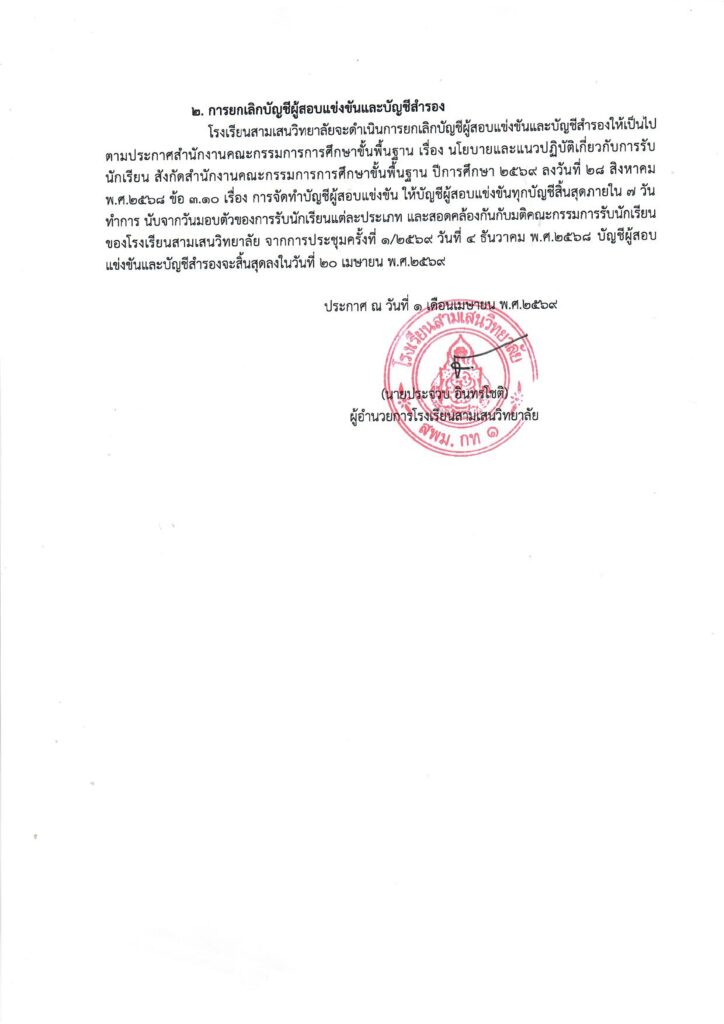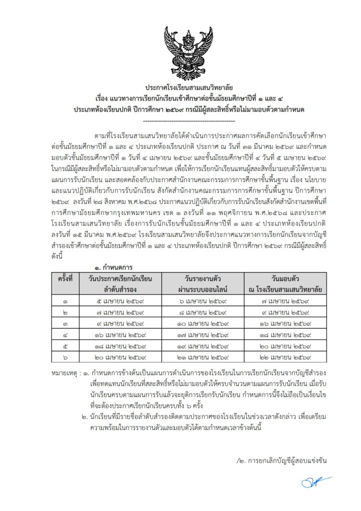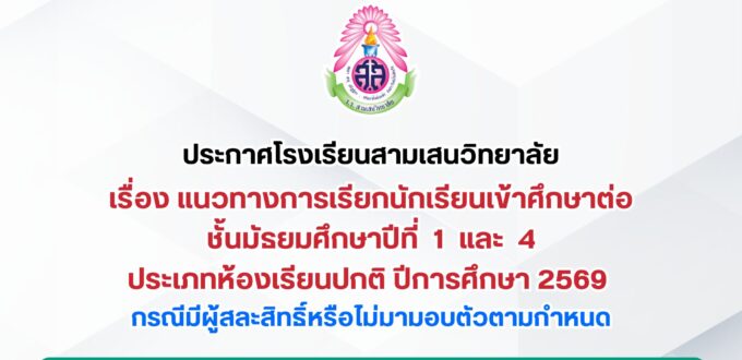 ประกาศโรงเรียนสามเสนวิทยาลัย เรื่อง แนวทางการเรียกนักเรียนเข้าศึกษาต่อชั้นมัธยมศึกษาปีที่ 1 และ 4 ประเภทห้องเรียนปกติ ปีการศึกษา 2569 กรณีมีผู้สละสิทธิ์หรือไม่มามอบตัวตามกำหนด ประกาศแนวทางเรียกสำรอง ม.1 และ ม.4 ห้องเรียนปกติ ปีการศึกษา 2569