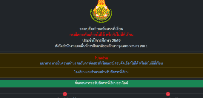 ระบบรับคำขอจัดสรรที่เรียน กรณีสอบคัดเลือกไม่ได้ หรือยังไม่มีที่เรียน ประจำปีการศึกษา 2569 สังกัดสำนักงานเขตพื้นที่การศึกษามัธยมศึกษากรุงเทพมหานคร เขต 1 ลงทะเบียนขอรับจัดสรรที่เรียน (ม.1 วันที่ 1-5 เม.ย. 2569) – (ม.4 วันที่ 2-5 เม.ย. 2569)