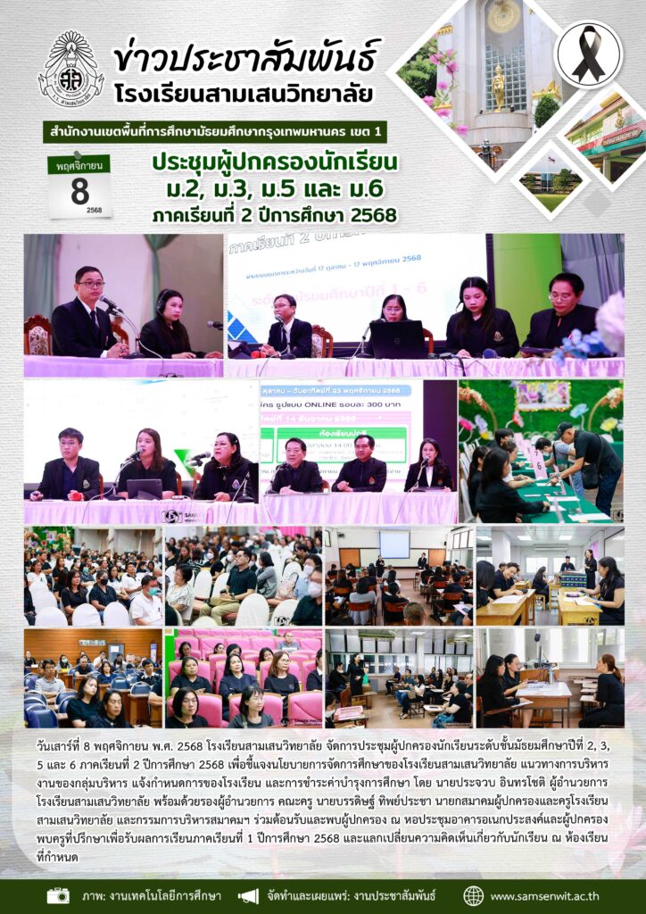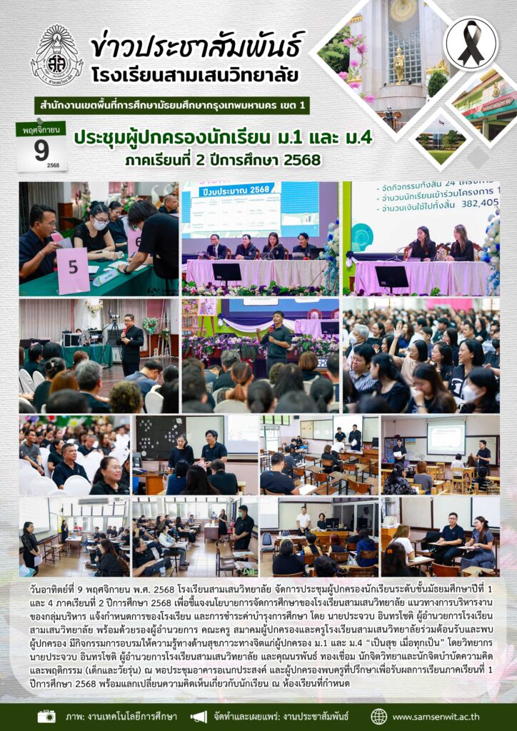 9 พฤศจิกายน 2568 กิจกรรมประชุมผู้ปกครองนักเรียน ม.1 และ ม.4 ภาคเรียนที่ 2 ปีการศึกษา 2568 และกิจกรรมการอบรมให้ความรู้ทางด้านสุขภาวะทางจิตแก่ผู้ปกครอง ม.1 และ ม.4 “เป็นสุข เมื่อทุกเป็น”