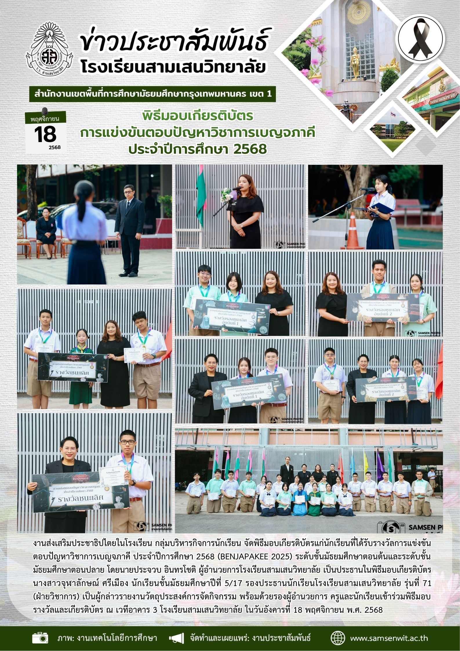 2. สมัครคัดเลือกเป็นตัวแทนโรงเรียนเข้าแข่งขันพูดภาษาอังกฤษนำเสนอนวัตกรรมทางธุรกิจระดับนานาชาติ (Innovation Pitching Competition) สำหรับ ม.4-5 ในวันที่ 10-11 มกราคม 2569 เพื่อชิงรางวัลทัศนศึกษาระยะสั้น ณ เมืองเพิร์ธ ประเทศออสเตรเลีย รางวัลอื่น ๆ เช่น ipad และ Airpods และเกียรติบัตรการแข่งขันจาก Curtin University