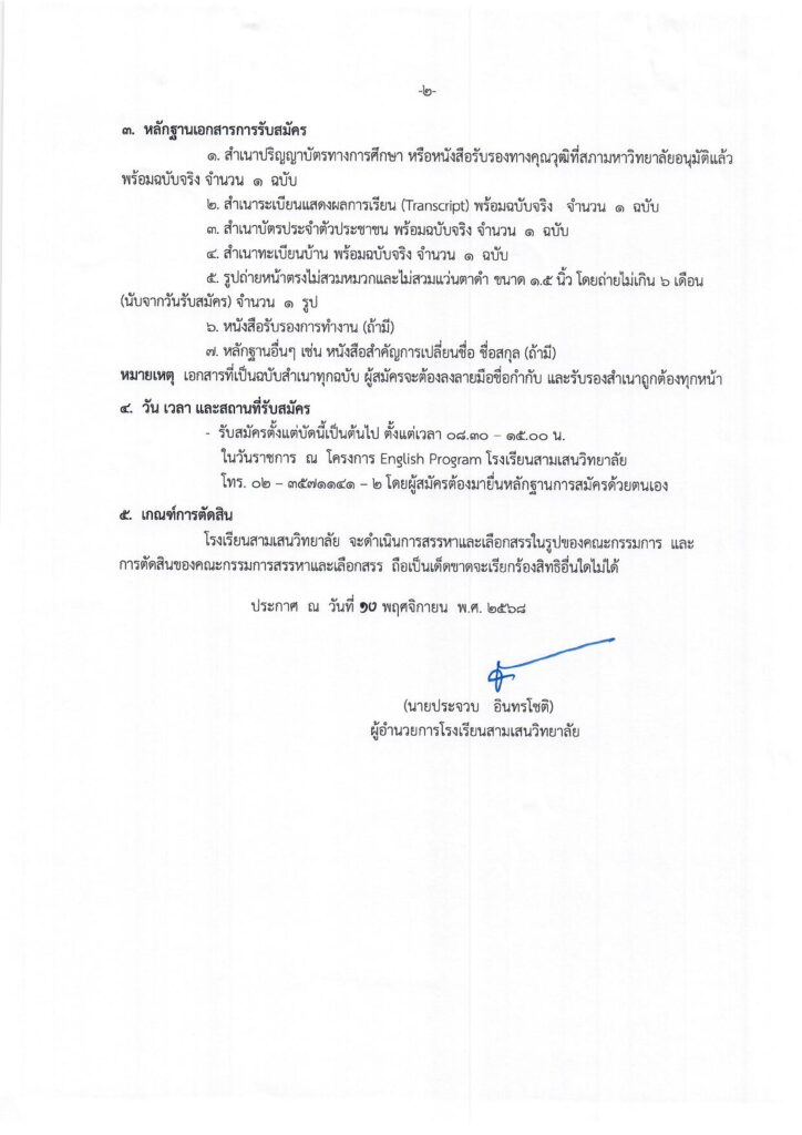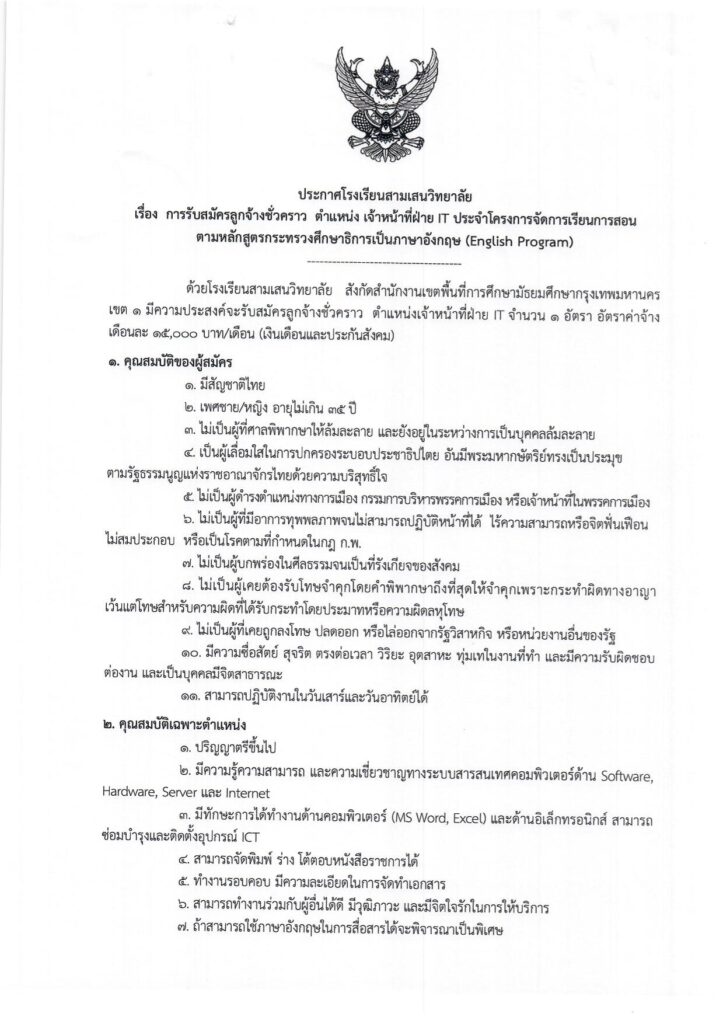 ประกาศโรงเรียนสามเสนวิทยาลัย เรื่อง การรับสมัครลูกจ้างชั่วคราว ตำแหน่ง เจ้าหน้าที่ฝ่าย IT ประจำโครงการจัดการเรียนการสอนตามหลักสูตรกระทรวงศึกษาธิการเป็นภาษาอังกฤษ (English Program) ประกาศรับสมัครเจ้าหน้าที่ IT (EP)