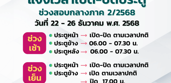 วันศุกร์ที่ 19 ธันวาคม พ.ศ. 2568 เข้าแถวเร็วขึ้น 10 นาที เข้าแถวเวลา 07.20 น. เนื่องจากมีกิจกรรมวันคริสต์มาส (Christmas Day)
