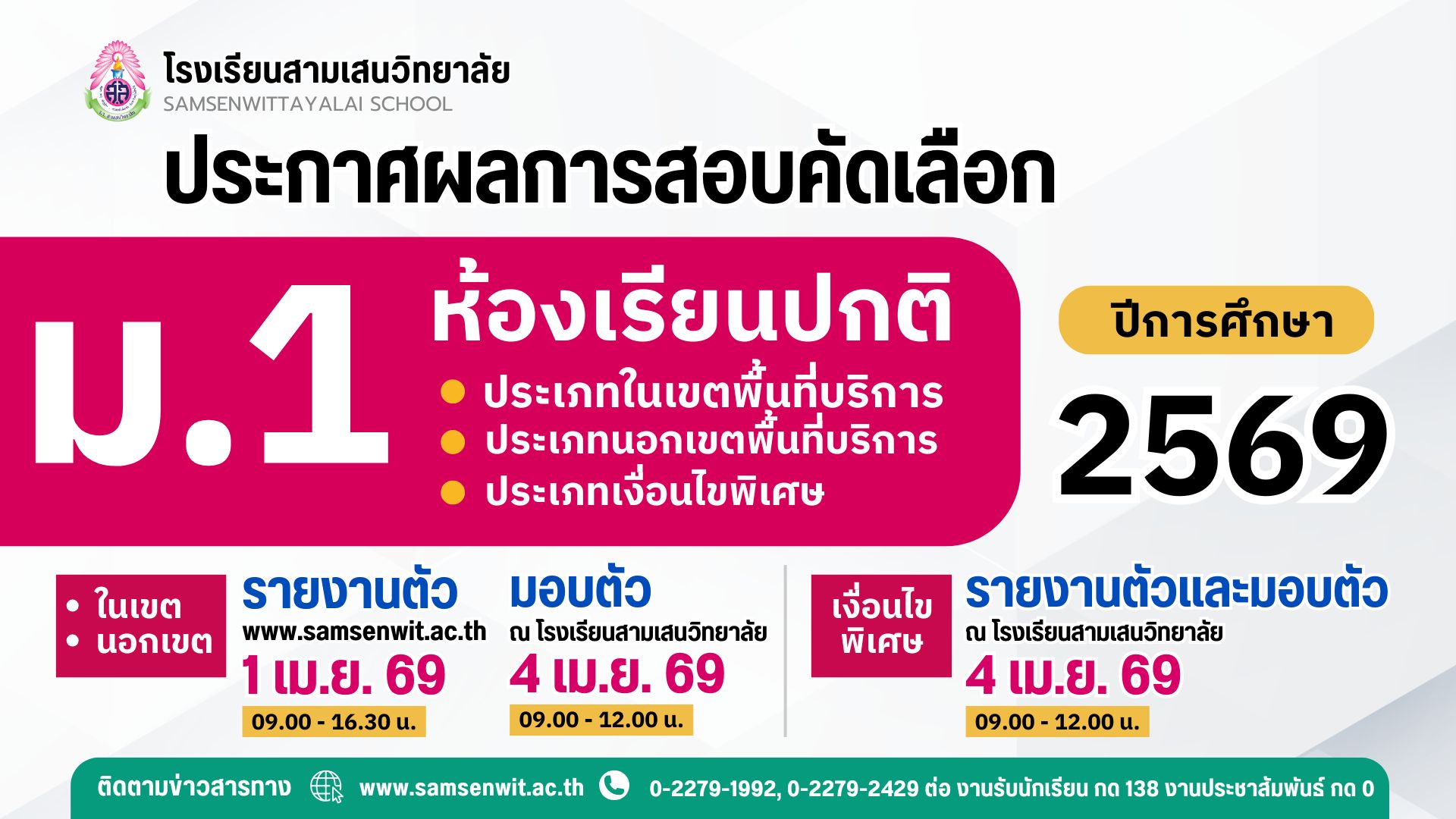 ลิงก์รายงานตัวและมอบตัว **เฉพาะนักเรียนที่ผ่านการคัดเลือก ม.1 ในเขต และนอกเขตฯ** (ประกาศ ณ วันที่ 31 มีนาคม 2569)