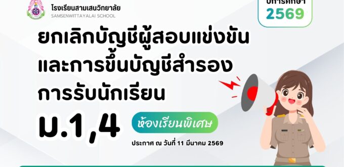 ประกาศโรงเรียนสามเสนวิทยาลัย เรื่อง ยกเลิกบัญชีผู้สอบแข่งขันและการขึ้นบัญชีสำรอง การรับนักเรียนชั้นมัธยมศึกษาปีที่ 1 และ 4 ประเภทห้องเรียนพิเศษ ปีการศึกษา 2569