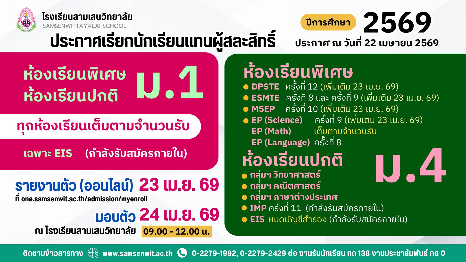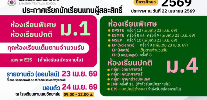 ประกาศโรงเรียนสามเสนวิทยาลัย เรื่อง เรียกนักเรียนแทนผู้สละสิทธิ์เข้าศึกษาต่อระดับชั้นมัธยมศึกษาปีที่ 4 ปีการศึกษา 2569 (ประกาศ ณ วันที่ 22 เมษายน 2569) อัปเดต 23 เม.ย. 69
