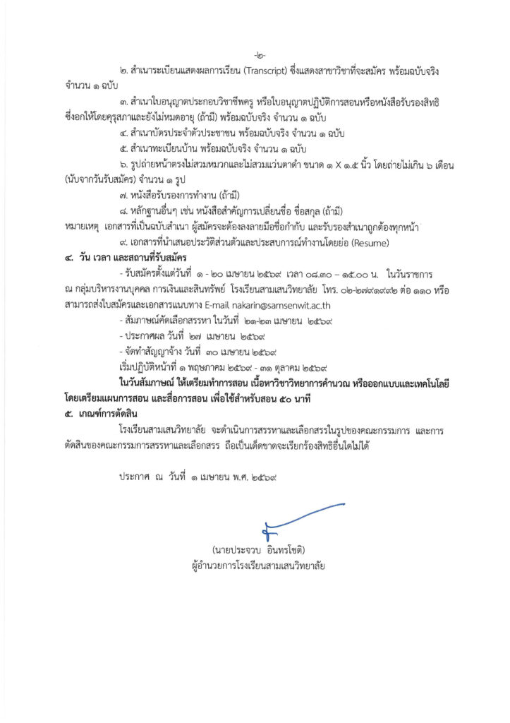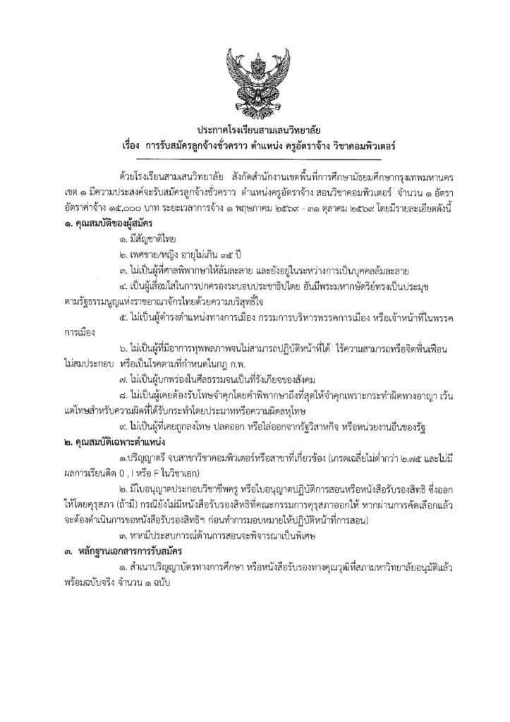 ประกาศโรงเรียนสามเสนวิทยาลัย เรื่อง การรับสมัครลูกจ้างชั่วคราว ตำแหน่ง ครูอัตราจ้าง วิชาคอมพิวเตอร์ จำนวน 1 อัตรา (รับสมัคร 1 – 20 เม.ย.69) ดาวน์โหลดประกาศและใบสมัคร