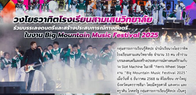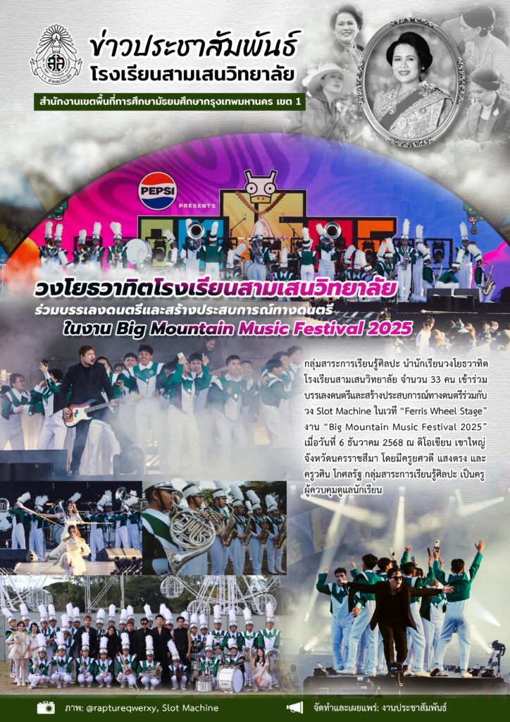 6 ธันวาคม 2568 วงโยธวาทิตโรงเรียนสามเสนวิทยาลัย ร่วมบรรเลงดนตรีและสร้างประสบการณ์ทางดนตรี ร่วมกับวง Slot Machine ในงาน “Big Mountain Music Festival 2025”