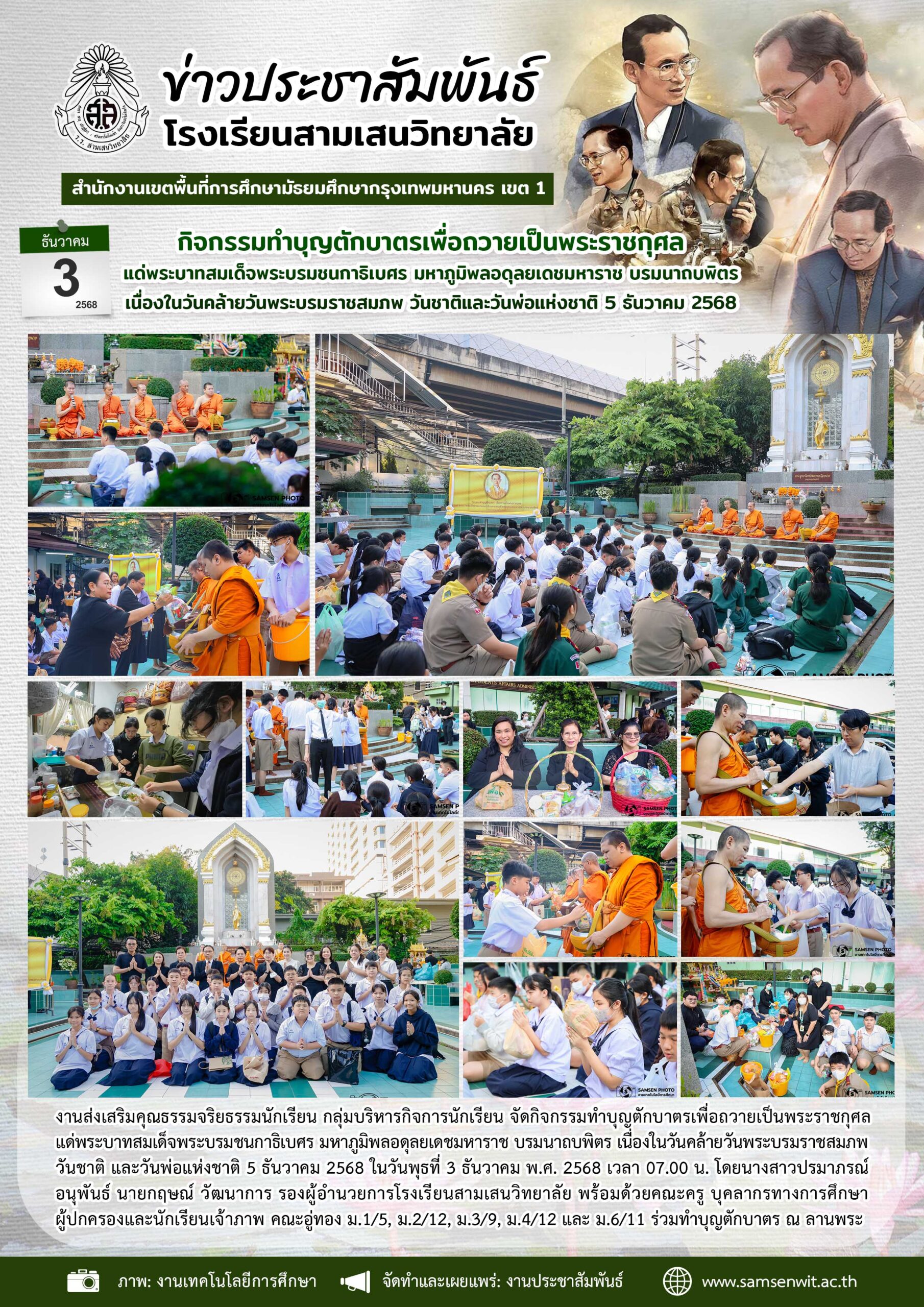 3 ธันวาคม 2568 งานส่งเสริมคุณธรรมจริยธรรมนักเรียน โรงเรียนสามเสนวิทยาลัย จัดกิจกรรมทำบุญตักบาตรเพื่อถวายเป็นพระราชกุศลแด่พระบาทสมเด็จพระบรมชนกาธิเบศร มหาภูมิพลอดุลยเดชมหาราช บรมนาถบพิตรเนื่องในวันคล้ายวันพระบรมราชสมภพ วันชาติและวันพ่อแห่งชาติ 5 ธันวาคม 2568