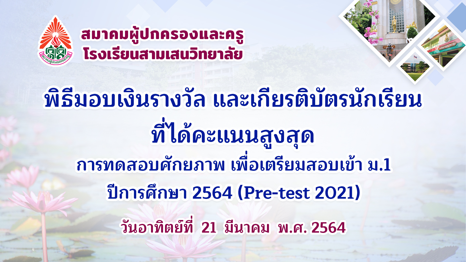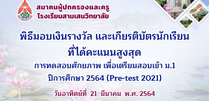 พิธีมอบเงินรางวัล และเกียรติบัตรนักเรียน ที่ได้คะแนสูงสุด การมดสอบศักยภาพ เพื่อเตรียมสอบเข้า ม.1 ปีการศึกษา 2564 (Pre-test 2021) วันอาทิตย์ที่ 21 มีนาคม พ.ศ. 2564