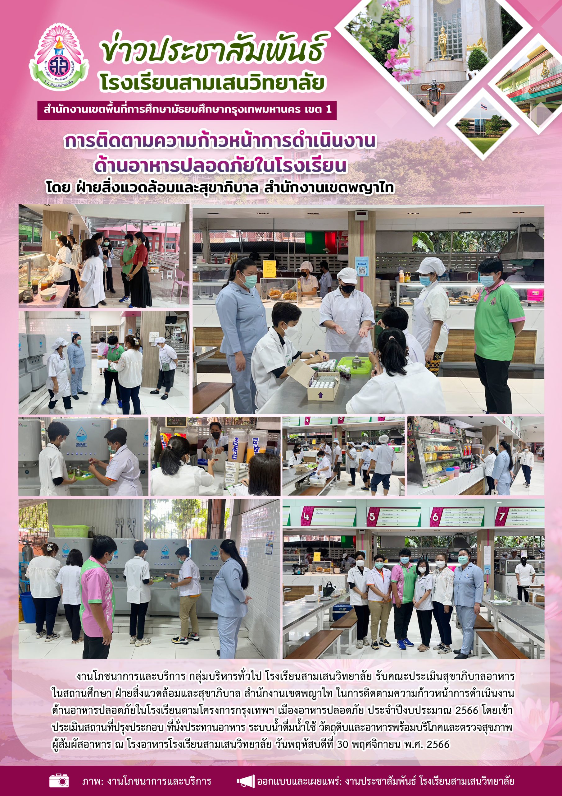 30 พฤศจิกายน 2566 งานโภชนาการและโรงอาหาร โรงเรียนสามเสนวิทยาลัย รับคณะประเมินสุขาภิบาลอาหารในสถานศึกษา ฝ่ายสิ่งแวดล้อมและสุขาภิบาล สำนักงานเขตพญาไท ในการติดตามความก้าวหน้าการดำเนินงานด้านอาหารปลอดภัยในโรงเรียนตามโครงการกรุงเทพฯ เมืองอาหารปลอดภัย ประจำปีงบประมาณ 2566