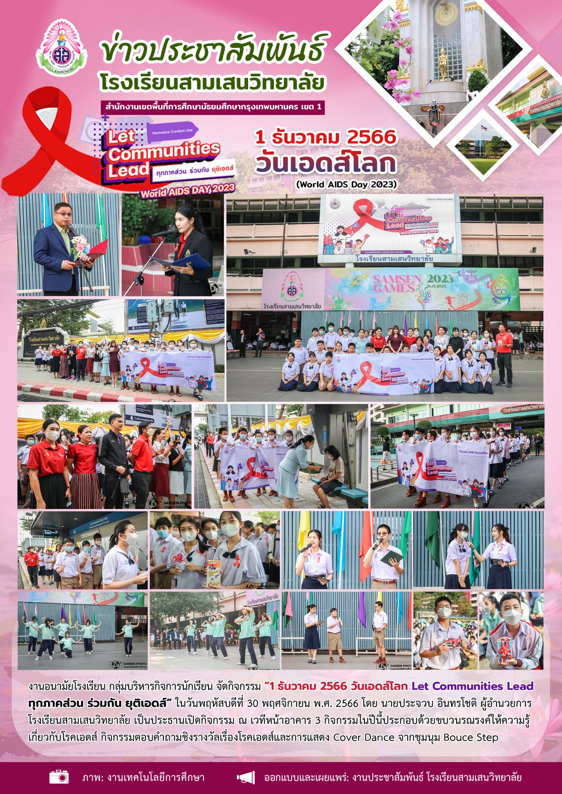 30 พฤศจิกายน 2566 กิจกรรม “1 ธันวาคม 2566 วันเอดส์โลก Let Communities Lead ทุกภาคส่วน ร่วมกัน ยุติเอดส์” โดย งานอนามัยโรงเรียน กลุ่มบริหารกิจการนักเรียน