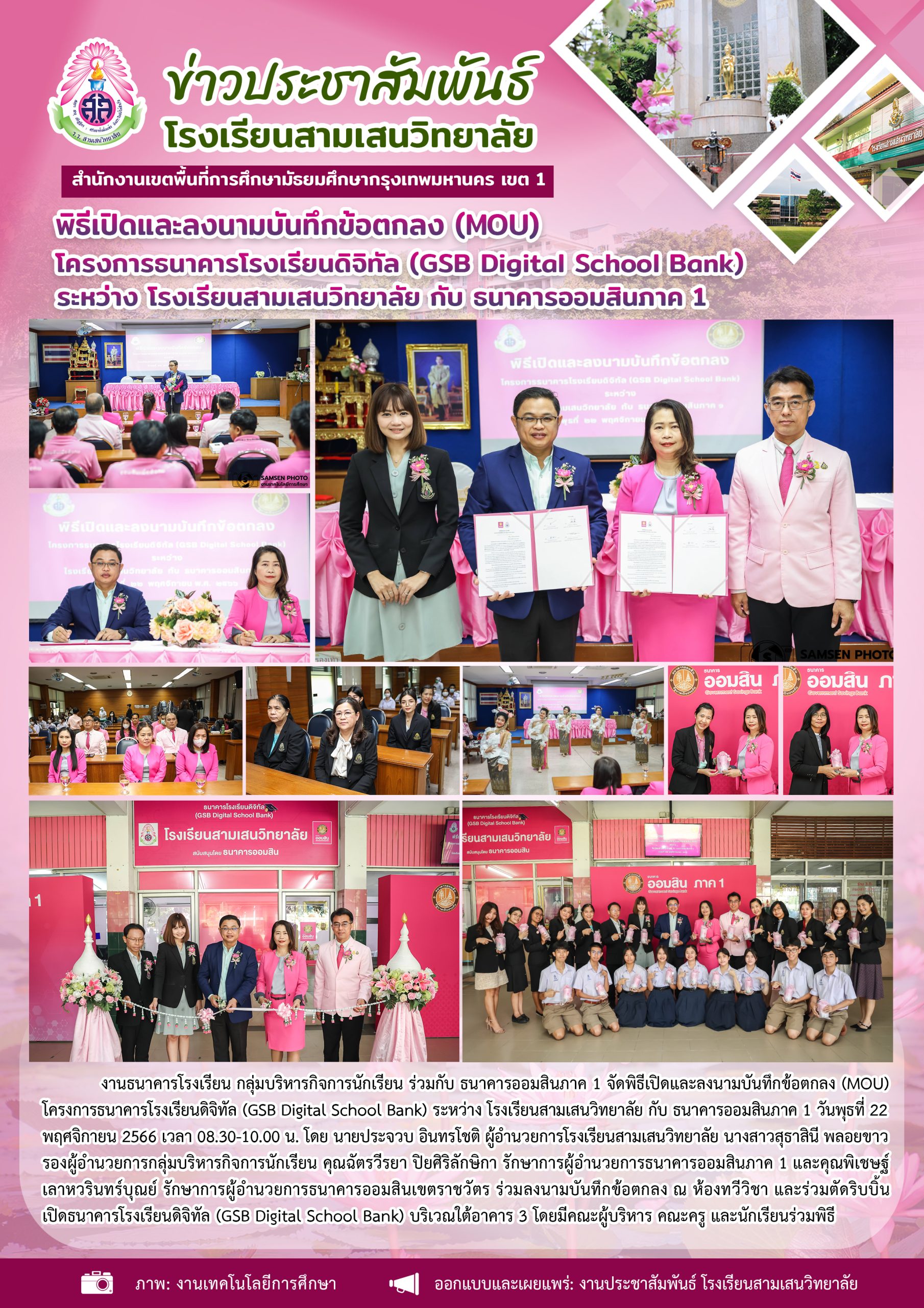 22 พฤศจิกายน 2566 พิธีเปิดและลงนามบันทึกข้อตกลง (MOU) โครงการธนาคารโรงเรียนดิจิทัล (GSB Digital School Bank) ระหว่าง โรงเรียนสามเสนวิทยาลัย กับ ธนาคารออมสินภาค 1